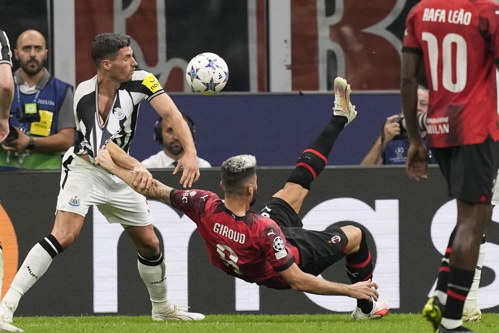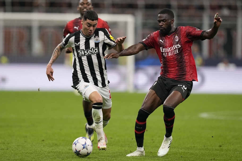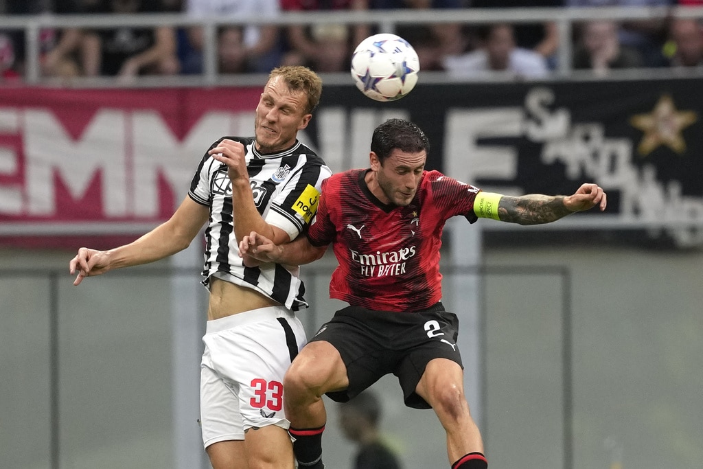 Newcastle’s Dan Burn, left, goes for the header with AC Milan’s Davide Calabria during the Champions League group F soccer match between AC Milan and Newcastle at the San Siro stadium in Milan, Italy, Tuesday, Sept. 19, 2023. (AP Photo/Antonio Calanni)AC Milan’s Olivier Giroud, left, challenges for the ball with Newcastle’s Sven Botman during the Champions League group F soccer match between AC Milan and Newcastle at the San Siro stadium in Milan, Italy, Tuesday, Sept. 19, 2023. (AP Photo/Antonio Calanni)Newcastle’s Fabian Schaer, left, goes for the header withAC Milan’s Tommaso Pobega during the Champions League group F soccer match between AC Milan and Newcastle at the San Siro stadium in Milan, Italy, Tuesday, Sept. 19, 2023. (AP Photo/Antonio Calanni)AC Milan’s Tommaso Pobega, left, challenges for the ball with Newcastle’s Sean Longstaff during the Champions League group F soccer match between AC Milan and Newcastle at the San Siro stadium in Milan, Italy, Tuesday, Sept. 19, 2023. (AP Photo/Antonio Calanni)Newcastle’s Jacob Murphy, right, is tackled by AC Milan’s Fikayo Tomori during the Champions League group F soccer match between AC Milan and Newcastle at the San Siro stadium in Milan, Italy, Tuesday, Sept. 19, 2023. (AP Photo/Antonio Calanni)Newcastle’s Sandro Tonali applauds as he leaves the pitch during the Champions League group F soccer match between AC Milan and Newcastle at the San Siro stadium in Milan, Italy, Tuesday, Sept. 19, 2023. (AP Photo/Antonio Calanni)AC Milan’s Olivier Giroud makes an attempt to score during the Champions League group F soccer match between AC Milan and Newcastle at the San Siro stadium in Milan, Italy, Tuesday, Sept. 19, 2023. (AP Photo/Antonio Calanni)Newcastle’s Miguel Almiron, left, challenges for the ball with AC Milan’s Rafael Leao during the Champions League group F soccer match between AC Milan and Newcastle at the San Siro stadium in Milan, Italy, Tuesday, Sept. 19, 2023. (AP Photo/Antonio Calanni)AC Milan’s goalkeeper Mike Maignan, left, is replaced by goalkeeper Marco Sportiello during the Champions League group F soccer match between AC Milan and Newcastle at the San Siro stadium in Milan, Italy, Tuesday, Sept. 19, 2023. (AP Photo/Antonio Calanni)Newcastle’s Bruno Guimaraes, left, challenges for the ball with AC Milan’s Yunus Musah during the Champions League group F soccer match between AC Milan and Newcastle at the San Siro stadium in Milan, Italy, Tuesday, Sept. 19, 2023. (AP Photo/Antonio Calanni)Newcastle’s Miguel Almiron, left, challenges for the ball with AC Milan’s Fikayo Tomori during the Champions League group F soccer match between AC Milan and Newcastle at the San Siro stadium in Milan, Italy, Tuesday, Sept. 19, 2023. (AP Photo/Antonio Calanni)Newcastle’s Sean Longstaff makes an attempt to score during the Champions League group F soccer match between AC Milan and Newcastle at the San Siro stadium in Milan, Italy, Tuesday, Sept. 19, 2023. (AP Photo/Antonio Calanni)MILAN, ITALY – SEPTEMBER 19: The players of Newcastle United pose for a team photo prior to the UEFA Champions League Group F match between AC Milan and Newcastle United FC at Stadio Giuseppe Meazza on September 19, 2023 in Milan, Italy. (Photo by Emilio Andreoli/Getty Images)