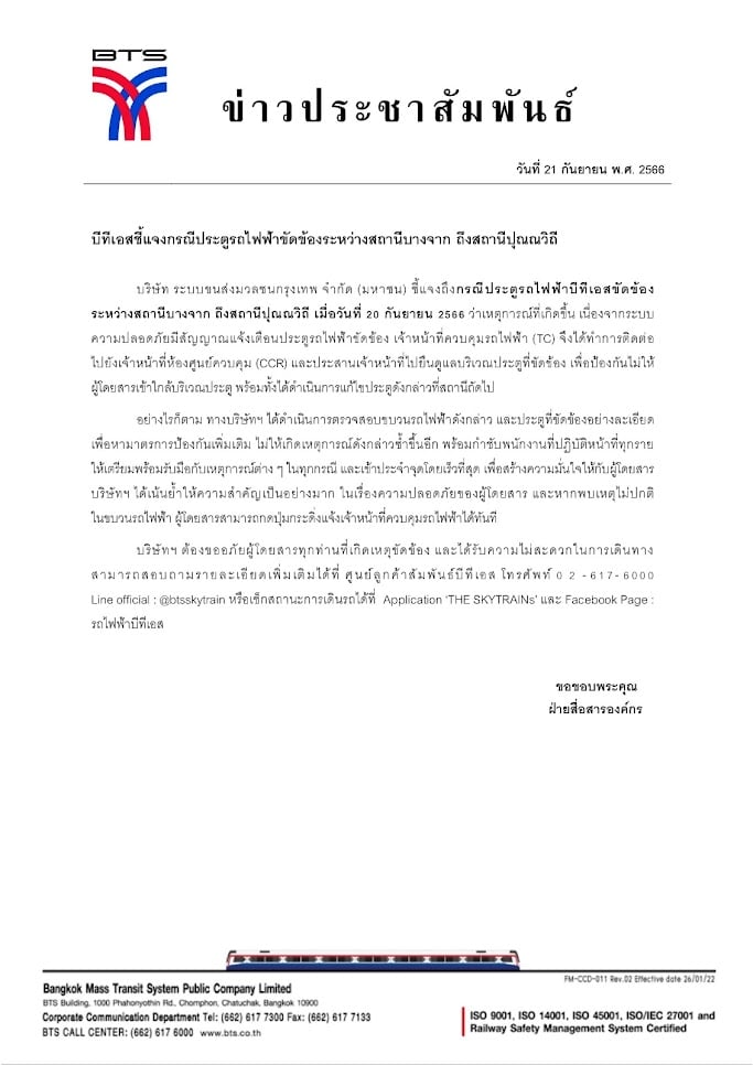 ล่าสุด บริษัท ระบบขนส่งมวลชนกรุงเทพ จำกัด (มหาชน) ชี้แจงถึงกรณีประตูรถไฟฟ้าบีทีเอสขัดข้องระหว่างสถานีบางจาก ถึงสถานีปุณณวิถี เมื่อวันที่ 20 กันยายน 2566 ว่าเหตุการณ์ที่เกิดขึ้น เนื่องจากระบบความปลอดภัยมีสัญญาณแจ้งเตือนประตูรถไฟฟ้าขัดข้อง