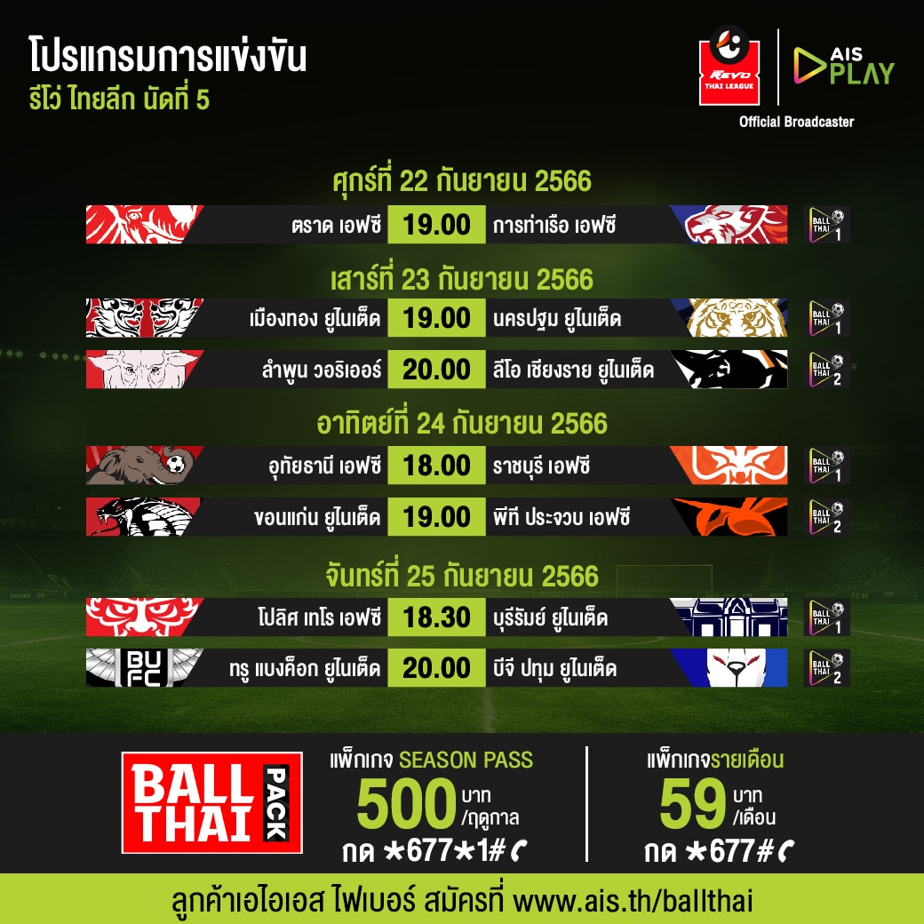 ตารางแข่งขัน รีโว่ 2023/24 ไทยลีก โปรแกรมฟุตบอลไทยลีก สัปดาห์ที่ 5 ทุกคู่ถ่ายทอดสดทาง AIS Play และ True Ball Thai