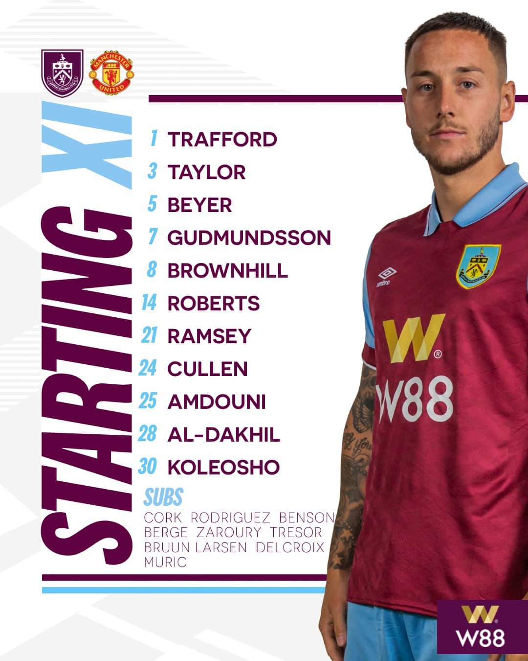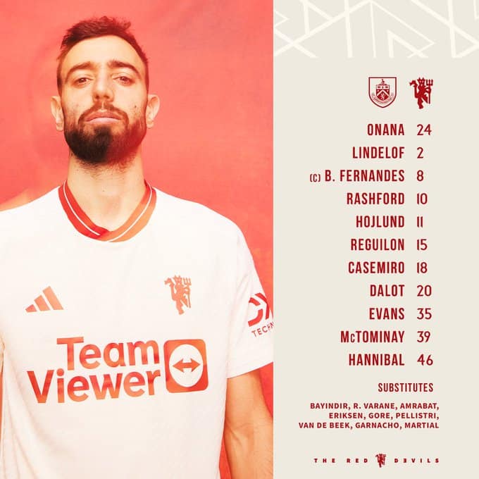 ผู้เล่นสำรอง : บายินดีร์, อัมราบัต, มาร์กซิยาล, เอริกเซ่น, การ์นาโช่, วาราน, เปยีสตรี, ฟาน เดอ เบ็ค, กอร์