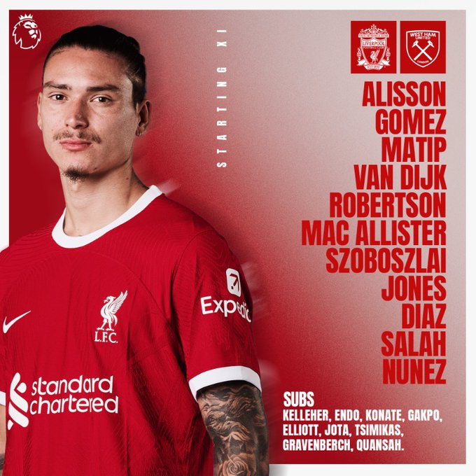 24 กันยายน 2566 รายชื่อผู้เล่น 11 ตัวจริง ลิเวอร์พูล พบ เวสต์แฮม ศึกฟุตบอลพรีเมียร์ ฤดูกาล 2023-24 คืนนี้ ลิงก์ถูกลิขสิทธิ์ ดูบอลสดออนไลน์ ทาง True Premier Football เวลา 20:00 น.