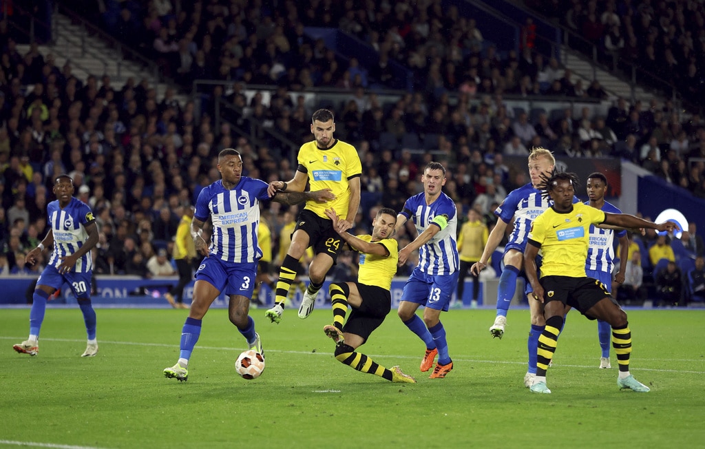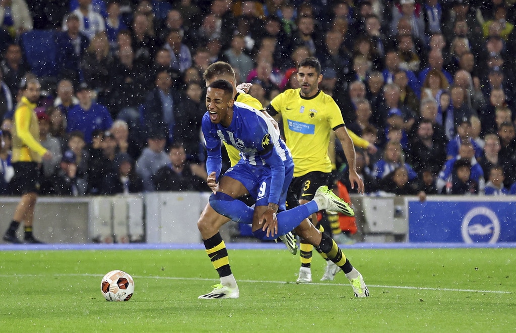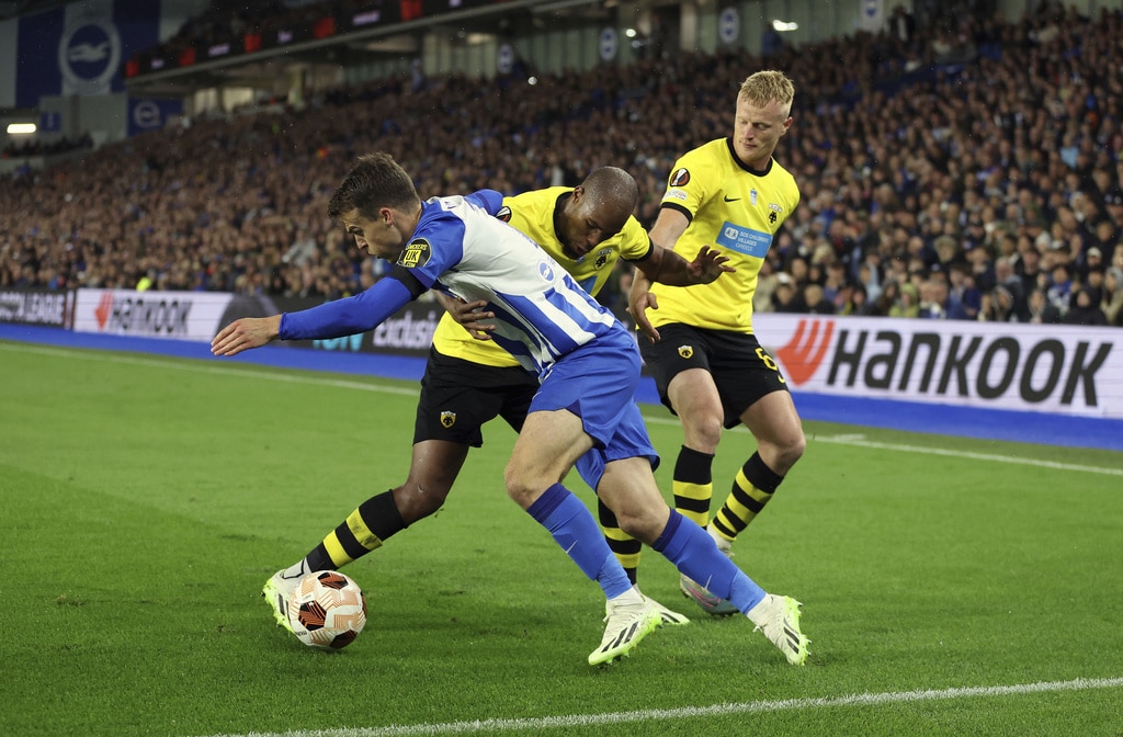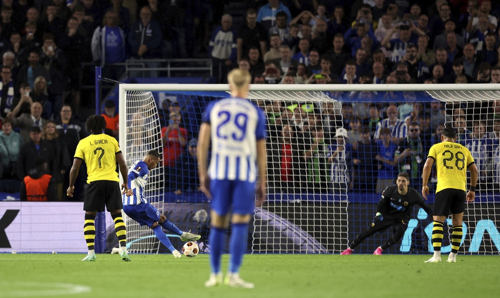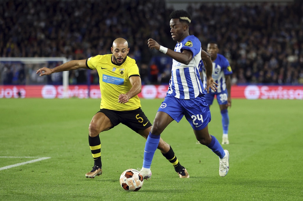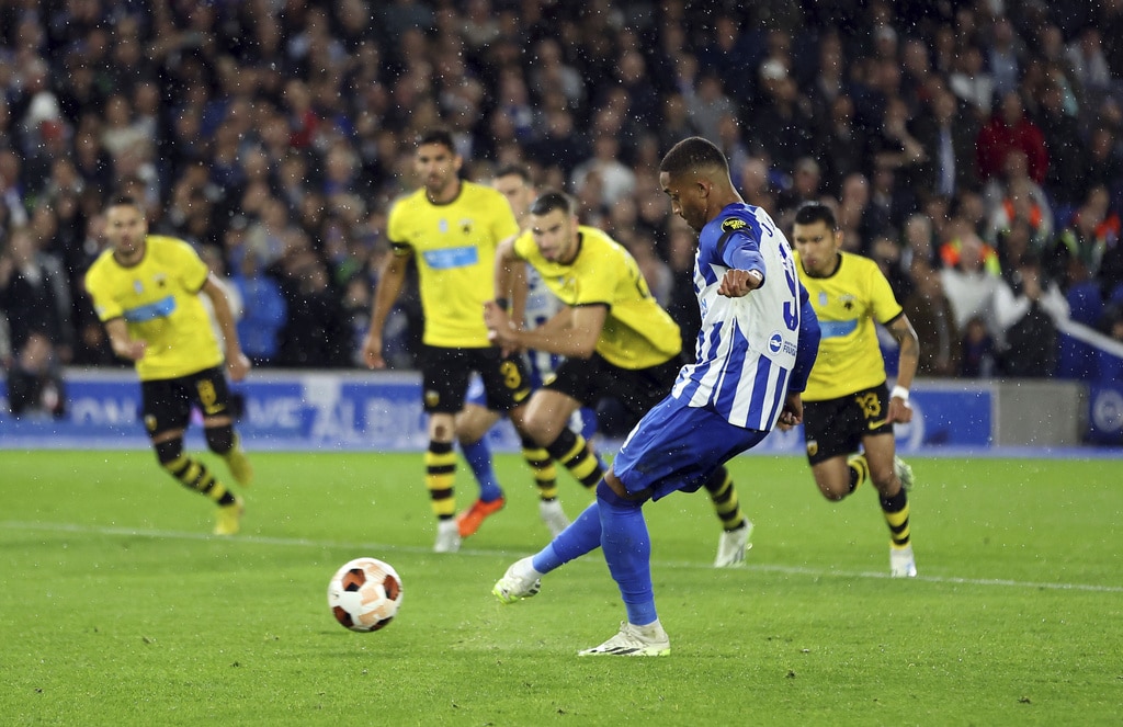 AEK Athens’ Djibril Sidibe, not pictured, beats Brighton and Hove Albion goalkeeper Jason Steele to score the opening goal during the UEFA Europa League Group B match at The AMEX, Brighton and Hove, England, Thursday Sept. 21, 2023. (Steven Paston//PA via AP)Brighton and Hove Albion’s Joao Pedro celebrates scoring their side’s first goal of the game during the UEFA Europa League Group B match at The AMEX, Brighton and Hove, England, Thursday Sept. 21, 2023. (Steven Paston/PA via AP)AEK Athens’ Mijat Gacinovic scores their side’s second goal of the game during the UEFA Europa League Group B match at The AMEX, Brighton and Hove, England, Thursday Sept. 21, 2023. (Steven Paston/PA via AP)AEK Athens’ Orbelin Pineda shoots under pressure from Brighton and Hove Albion’s Jan Paul van Hecke during the UEFA Europa League Group B match at The AMEX, Brighton and Hove, England, Thursday Sept. 21, 2023. (Steven Paston/PA via AP)AEK Athens’ Djibril Sidibe and Brighton and Hove Albion’s Solly March, left, battle for the ball during the Europa League Group B soccer match at The AMEX, Brighton and Hov, England, Thursday Sept. 21, 2023. (Steven Paston/PA via AP)Brighton and Hove Albion’s Joao Pedro scores against AEK Athens during the Europa League Group B soccer match at The AMEX, Brighton and Hov, England, Thursday Sept. 21, 2023. (Steven Paston/PA via AP)AEK Athens’ Damian Szymanski concedes a penalty for a foul on Brighton and Hove Albion’s Joao Pedro which is awarded after a VAR check during the Europa League Group B soccer match at The AMEX, Brighton and Hov, England, Thursday Sept. 21, 2023. (Steven Paston/PA via AP)Brighton and Hove Albion’s Joao Pedro reacts after he was fouled for a penalty during the Europa League Group B soccer match at The AMEX, Brighton and Hov, England, Thursday Sept. 21, 2023. (Steven Paston/PA via AP)AEK Athens’ Ezequiel Ponce celebrates scoring against Brighton and Hove Albion during the Europa League Group B soccer match at The AMEX, Brighton and Hov, England, Thursday Sept. 21, 2023. (Steven Paston/PA via AP)Brighton and Hove Albion’s Simon Adingra, right, and AEK Athens’ Nordin Amrabat in action during the Europa League Group B soccer match at The AMEX, Brighton and Hov, England, Thursday Sept. 21, 2023. (Steven Paston/PA via AP)AEK Athens’ Gerasimos Mitoglou and Brighton and Hove Albion’s Danny Welbeck, right, battle for the ball during the Europa League Group B soccer match at The AMEX, Brighton and Hov, England, Thursday Sept. 21, 2023. (Steven Paston/PA via AP)