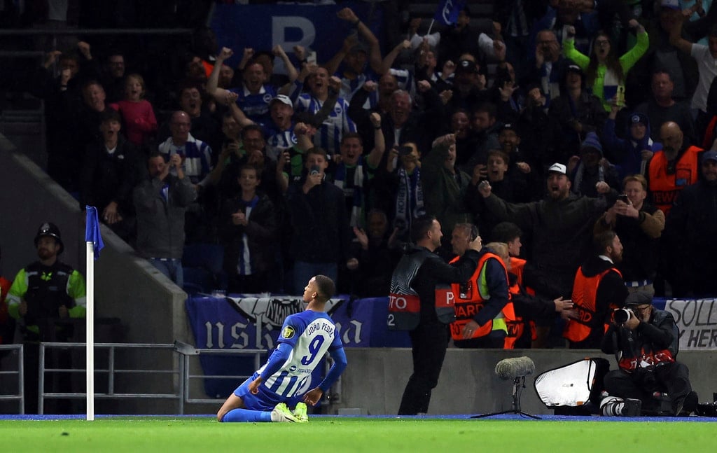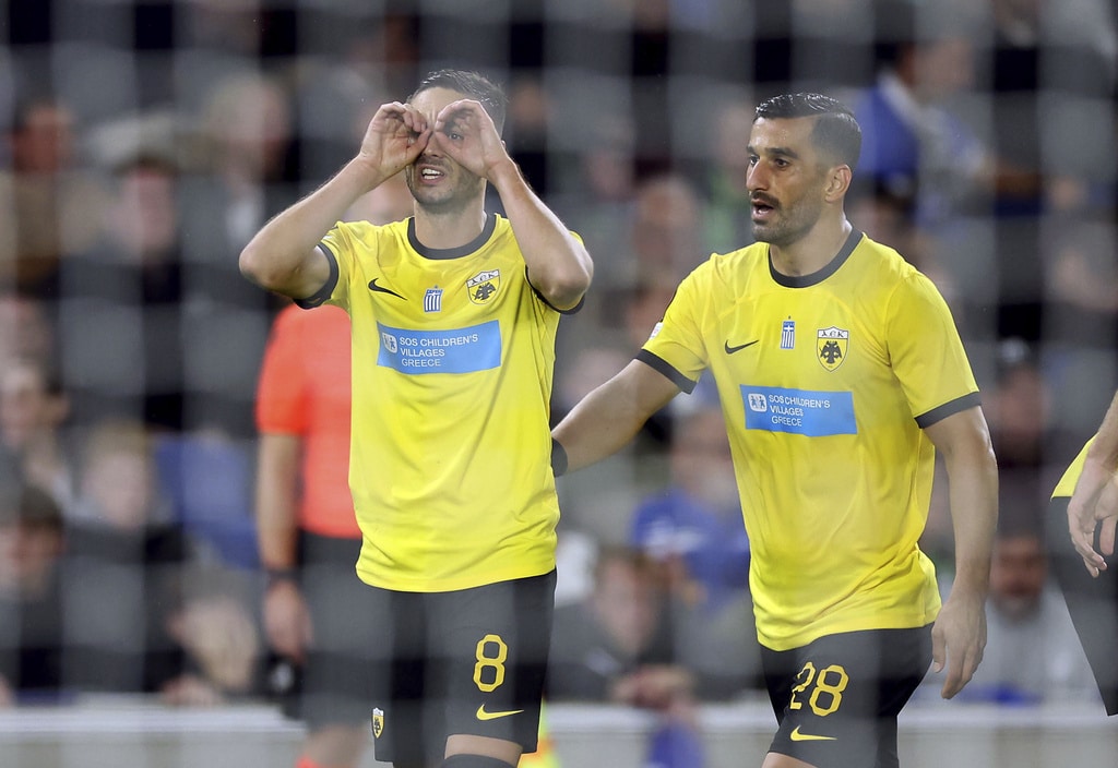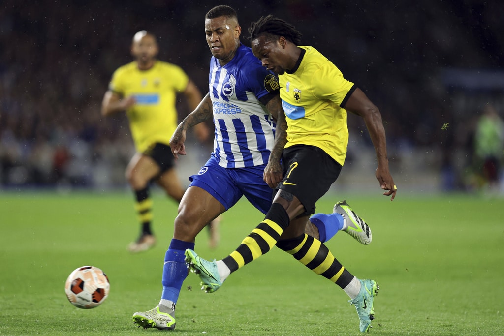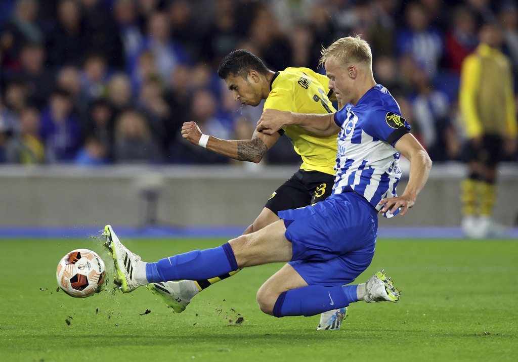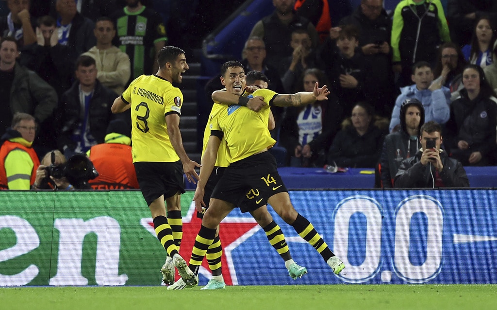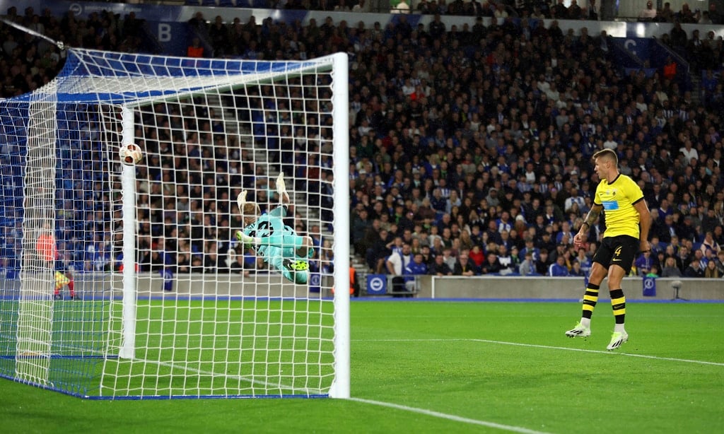 AEK Athens’ Djibril Sidibe, not pictured, beats Brighton and Hove Albion goalkeeper Jason Steele to score the opening goal during the UEFA Europa League Group B match at The AMEX, Brighton and Hove, England, Thursday Sept. 21, 2023. (Steven Paston//PA via AP)Brighton and Hove Albion’s Joao Pedro celebrates scoring their side’s first goal of the game during the UEFA Europa League Group B match at The AMEX, Brighton and Hove, England, Thursday Sept. 21, 2023. (Steven Paston/PA via AP)AEK Athens’ Mijat Gacinovic scores their side’s second goal of the game during the UEFA Europa League Group B match at The AMEX, Brighton and Hove, England, Thursday Sept. 21, 2023. (Steven Paston/PA via AP)AEK Athens’ Orbelin Pineda shoots under pressure from Brighton and Hove Albion’s Jan Paul van Hecke during the UEFA Europa League Group B match at The AMEX, Brighton and Hove, England, Thursday Sept. 21, 2023. (Steven Paston/PA via AP)AEK Athens’ Djibril Sidibe and Brighton and Hove Albion’s Solly March, left, battle for the ball during the Europa League Group B soccer match at The AMEX, Brighton and Hov, England, Thursday Sept. 21, 2023. (Steven Paston/PA via AP)Brighton and Hove Albion’s Joao Pedro scores against AEK Athens during the Europa League Group B soccer match at The AMEX, Brighton and Hov, England, Thursday Sept. 21, 2023. (Steven Paston/PA via AP)AEK Athens’ Damian Szymanski concedes a penalty for a foul on Brighton and Hove Albion’s Joao Pedro which is awarded after a VAR check during the Europa League Group B soccer match at The AMEX, Brighton and Hov, England, Thursday Sept. 21, 2023. (Steven Paston/PA via AP)Brighton and Hove Albion’s Joao Pedro reacts after he was fouled for a penalty during the Europa League Group B soccer match at The AMEX, Brighton and Hov, England, Thursday Sept. 21, 2023. (Steven Paston/PA via AP)AEK Athens’ Ezequiel Ponce celebrates scoring against Brighton and Hove Albion during the Europa League Group B soccer match at The AMEX, Brighton and Hov, England, Thursday Sept. 21, 2023. (Steven Paston/PA via AP)Brighton and Hove Albion’s Simon Adingra, right, and AEK Athens’ Nordin Amrabat in action during the Europa League Group B soccer match at The AMEX, Brighton and Hov, England, Thursday Sept. 21, 2023. (Steven Paston/PA via AP)AEK Athens’ Gerasimos Mitoglou and Brighton and Hove Albion’s Danny Welbeck, right, battle for the ball during the Europa League Group B soccer match at The AMEX, Brighton and Hov, England, Thursday Sept. 21, 2023. (Steven Paston/PA via AP)