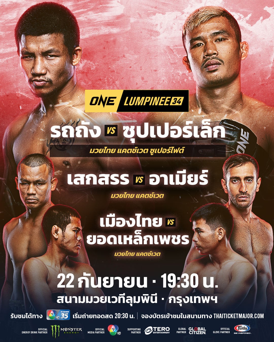 โปรแกรมมวย ONE ลุมพินี 34 สัปดาห์นี้ คู่เอก คู่หยุดโลกของรายการ “รถถัง จิตรเมืองนนท์” แชมป์โลก ONE มวยไทย รุ่นฟลายเวต (125 – 135 ป.) เดินหน้าลุยปะทะผู้ท้าชิงอันดับหนึ่งของแรงกิง “ซุปเปอร์เล็ก เกียรติหมู่ 9” เจ้าของเข็มขัดแชมป์โลก ONE คิกบ็อกซิ่ง รุ่นฟลายเวต โดยสุดท้าย ปรากฏว่าฝ่ายหลังตกตาชั่งทำให้หมดสิทธิ์ท้าชิง จึงตกลงสู้กันในกติกามวยไทย แคตช์เวต ซูเปอร์ไฟต์ 140 ป. แทน แต่ยังรับประกันความมันทะลุปรอทแตกเช่นเดิม