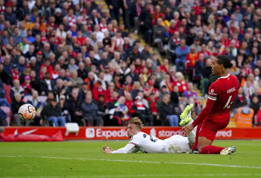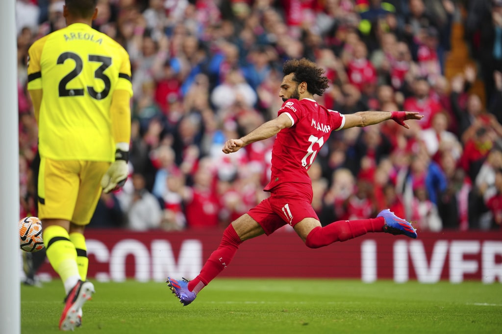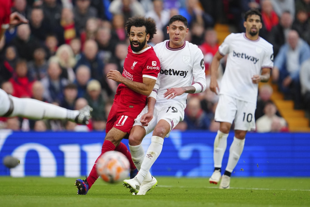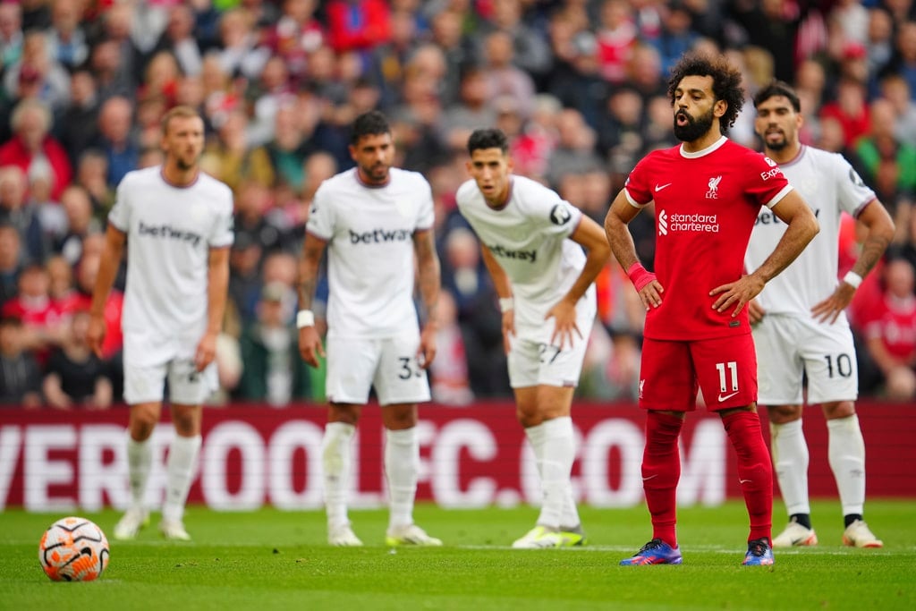 Liverpool’s Mohamed Salah scores his side’s opening goal from a penalty kick during the English Premier League soccer match between Liverpool and West Ham at the Anfield stadium in Liverpool, England, Sunday, Sept. 24, 2023. (AP Photo/Jon Super)West Ham United’s Jarrod Bowen scores his side’s first goal during the English Premier League soccer match between Liverpool and West Ham at the Anfield stadium in Liverpool, England, Sunday, Sept. 24, 2023. (Peter Byrne/PA via AP)Liverpool’s Mohamed Salah, left, celebrates after scoring his side’s opening goal with Liverpool’s Virgil van Dijk during the English Premier League soccer match between Liverpool and West Ham at the Anfield stadium in Liverpool, England, Sunday, Sept. 24, 2023. (AP Photo/Jon Super)Liverpool’s Mohamed Salah, right, prepares to score his side’s opening goal from a penalty kick during the English Premier League soccer match between Liverpool and West Ham at the Anfield stadium in Liverpool, England, Sunday, Sept. 24, 2023. (AP Photo/Jon Super)Liverpool’s Mohamed Salah scores his side’s opening goal from a penalty kick during the English Premier League soccer match between Liverpool and West Ham at the Anfield stadium in Liverpool, England, Sunday, Sept. 24, 2023. (AP Photo/Jon Super)Liverpool’s Mohamed Salah, centre left, is challenged by West Ham’s Edson Alvarez during the English Premier League soccer match between Liverpool and West Ham at the Anfield stadium in Liverpool, England, Sunday, Sept. 24, 2023. (AP Photo/Jon Super)West Ham’s Jarrod Bowen, bottom, scores his side’s opening goal during the English Premier League soccer match between Liverpool and West Ham at the Anfield stadium in Liverpool, England, Sunday, Sept. 24, 2023. (AP Photo/Jon Super)Liverpool’s Curtis Jones shoots on goal during the English Premier League soccer match between Liverpool and West Ham at the Anfield stadium in Liverpool, England, Sunday, Sept. 24, 2023. (AP Photo/Jon Super)Liverpool’s Dominik Szoboszlai is in action during the English Premier League soccer match between Liverpool and West Ham at the Anfield stadium in Liverpool, England, Sunday, Sept. 24, 2023. (AP Photo/Jon Super)Liverpool’s Diogo Jota is in action during the English Premier League soccer match between Liverpool and West Ham at the Anfield stadium in Liverpool, England, Sunday, Sept. 24, 2023. (AP Photo/Jon Super)Liverpool’s Darwin Nunez scores his side’s second goal of the game during the English Premier League soccer match between Liverpool and West Ham at the Anfield stadium in Liverpool, England, Sunday, Sept. 24, 2023. (Peter Byrne/PA via AP)Liverpool’s Darwin Nunez celebrates scoring his side’s second goal of the game during the English Premier League soccer match between Liverpool and West Ham at the Anfield stadium in Liverpool, England, Sunday, Sept. 24, 2023. (Peter Byrne/PA via AP)Liverpool’s Dominik Szoboszlai, left, and West Ham’s Lucas Paqueta vie for the ball during the English Premier League soccer match between Liverpool and West Ham at the Anfield stadium in Liverpool, England, Sunday, Sept. 24, 2023. (AP Photo/Jon Super)