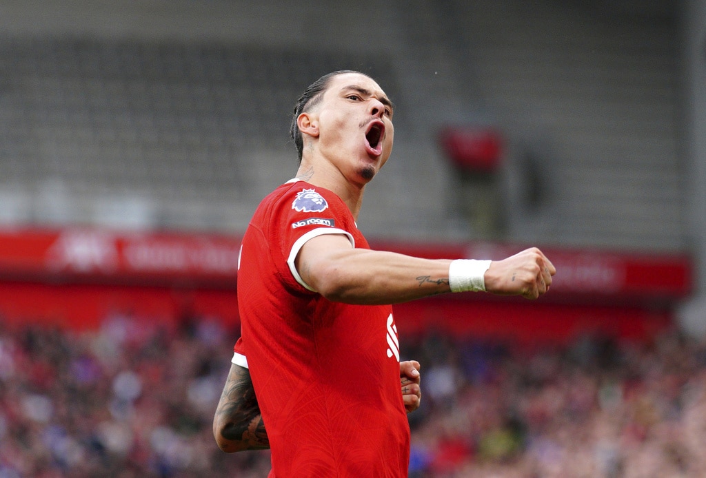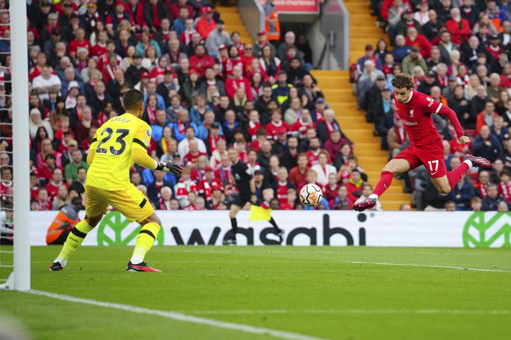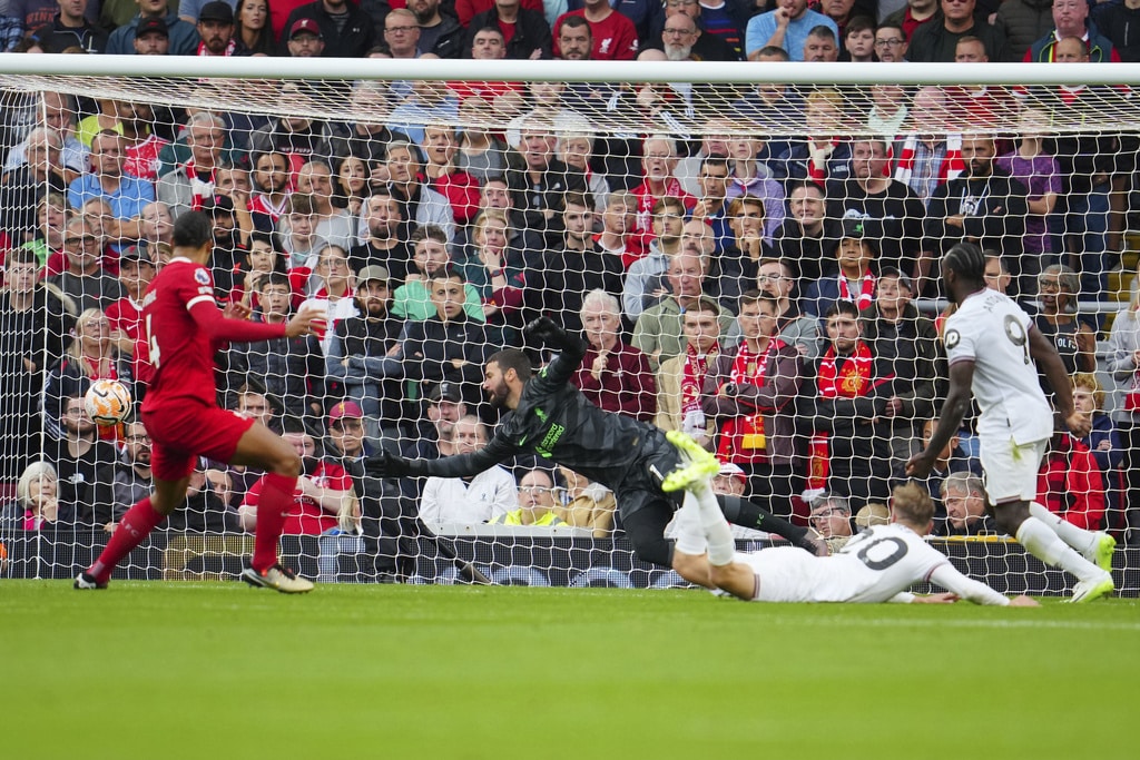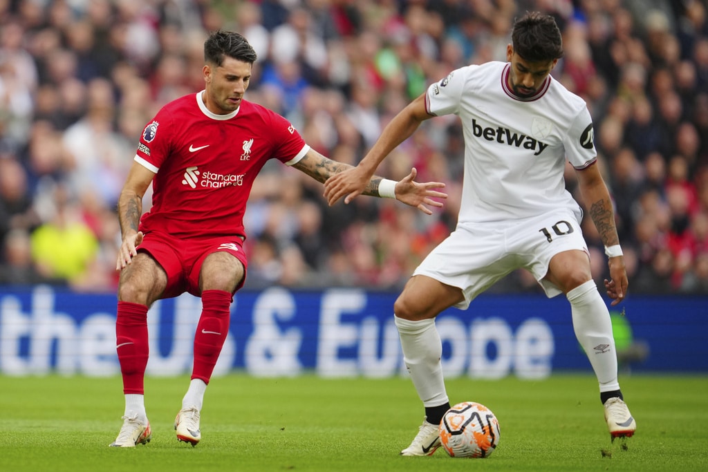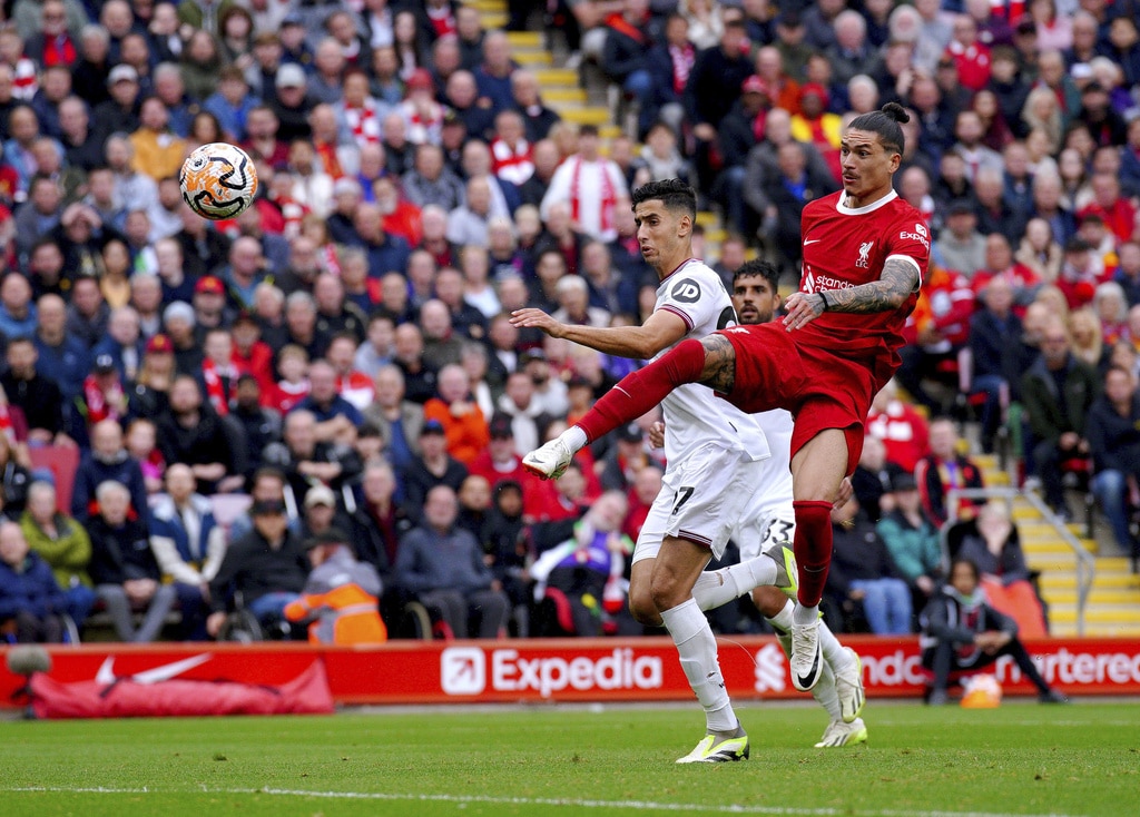 Liverpool’s Mohamed Salah scores his side’s opening goal from a penalty kick during the English Premier League soccer match between Liverpool and West Ham at the Anfield stadium in Liverpool, England, Sunday, Sept. 24, 2023. (AP Photo/Jon Super)West Ham United’s Jarrod Bowen scores his side’s first goal during the English Premier League soccer match between Liverpool and West Ham at the Anfield stadium in Liverpool, England, Sunday, Sept. 24, 2023. (Peter Byrne/PA via AP)Liverpool’s Mohamed Salah, left, celebrates after scoring his side’s opening goal with Liverpool’s Virgil van Dijk during the English Premier League soccer match between Liverpool and West Ham at the Anfield stadium in Liverpool, England, Sunday, Sept. 24, 2023. (AP Photo/Jon Super)Liverpool’s Mohamed Salah, right, prepares to score his side’s opening goal from a penalty kick during the English Premier League soccer match between Liverpool and West Ham at the Anfield stadium in Liverpool, England, Sunday, Sept. 24, 2023. (AP Photo/Jon Super)Liverpool’s Mohamed Salah scores his side’s opening goal from a penalty kick during the English Premier League soccer match between Liverpool and West Ham at the Anfield stadium in Liverpool, England, Sunday, Sept. 24, 2023. (AP Photo/Jon Super)Liverpool’s Mohamed Salah, centre left, is challenged by West Ham’s Edson Alvarez during the English Premier League soccer match between Liverpool and West Ham at the Anfield stadium in Liverpool, England, Sunday, Sept. 24, 2023. (AP Photo/Jon Super)West Ham’s Jarrod Bowen, bottom, scores his side’s opening goal during the English Premier League soccer match between Liverpool and West Ham at the Anfield stadium in Liverpool, England, Sunday, Sept. 24, 2023. (AP Photo/Jon Super)Liverpool’s Curtis Jones shoots on goal during the English Premier League soccer match between Liverpool and West Ham at the Anfield stadium in Liverpool, England, Sunday, Sept. 24, 2023. (AP Photo/Jon Super)Liverpool’s Dominik Szoboszlai is in action during the English Premier League soccer match between Liverpool and West Ham at the Anfield stadium in Liverpool, England, Sunday, Sept. 24, 2023. (AP Photo/Jon Super)Liverpool’s Diogo Jota is in action during the English Premier League soccer match between Liverpool and West Ham at the Anfield stadium in Liverpool, England, Sunday, Sept. 24, 2023. (AP Photo/Jon Super)Liverpool’s Darwin Nunez scores his side’s second goal of the game during the English Premier League soccer match between Liverpool and West Ham at the Anfield stadium in Liverpool, England, Sunday, Sept. 24, 2023. (Peter Byrne/PA via AP)Liverpool’s Darwin Nunez celebrates scoring his side’s second goal of the game during the English Premier League soccer match between Liverpool and West Ham at the Anfield stadium in Liverpool, England, Sunday, Sept. 24, 2023. (Peter Byrne/PA via AP)Liverpool’s Dominik Szoboszlai, left, and West Ham’s Lucas Paqueta vie for the ball during the English Premier League soccer match between Liverpool and West Ham at the Anfield stadium in Liverpool, England, Sunday, Sept. 24, 2023. (AP Photo/Jon Super)