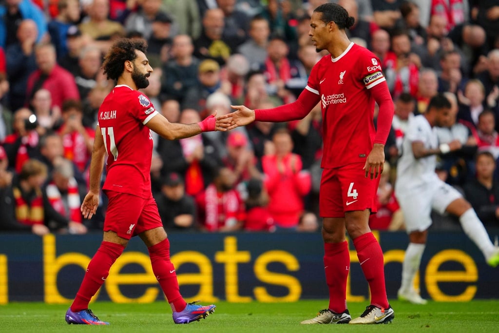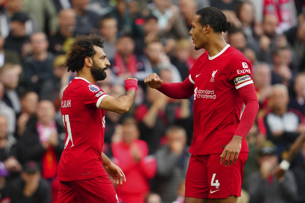 Liverpool’s Mohamed Salah, left, celebrates after scoring his side’s opening goal with Liverpool’s Virgil van Dijk during the English Premier League soccer match between Liverpool and West Ham at the Anfield stadium in Liverpool, England, Sunday, Sept. 24, 2023. (AP Photo/Jon Super)