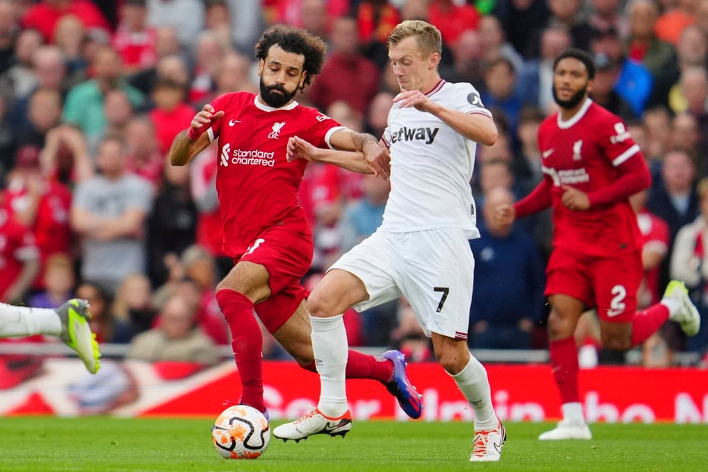 West Ham’s James Ward-Prowse, right, is challenged by Liverpool’s Mohamed Salah during the English Premier League soccer match between Liverpool and West Ham at the Anfield stadium in Liverpool, England, Sunday, Sept. 24, 2023. (AP Photo/Jon Super)