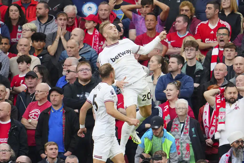 West Ham’s Jarrod Bowen celebrates after scoring his side’s opening goal during the English Premier League soccer match between Liverpool and West Ham at the Anfield stadium in Liverpool, England, Sunday, Sept. 24, 2023. (AP Photo/Jon Super)