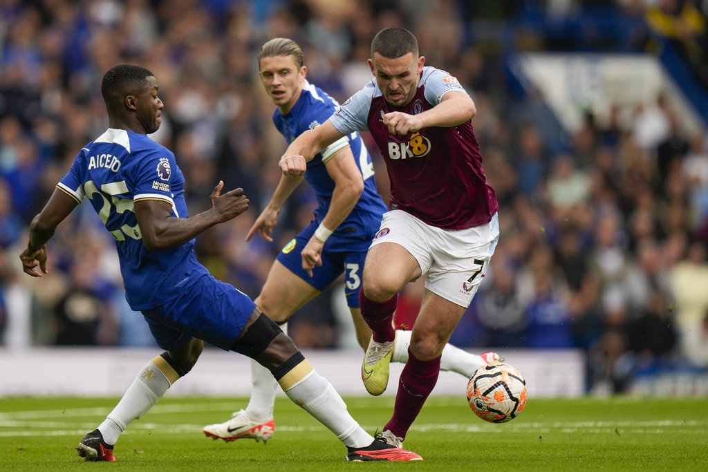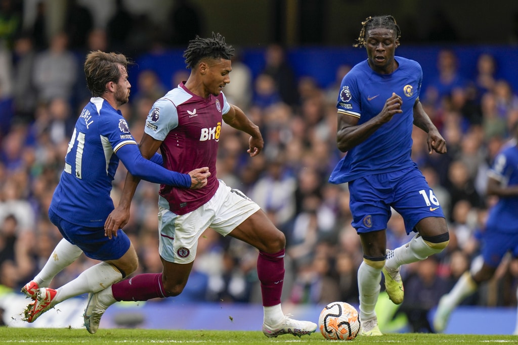 Aston Villa’s Ollie Watkins, center, duels for the ball with Chelsea’s Ben Chilwell, left, during the English Premier League soccer match between Chelsea and Aston Villa at Stamford Bridge stadium in London, Sunday, Sept. 24, 2023. (AP Photo/Alastair Grant)