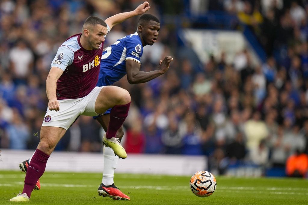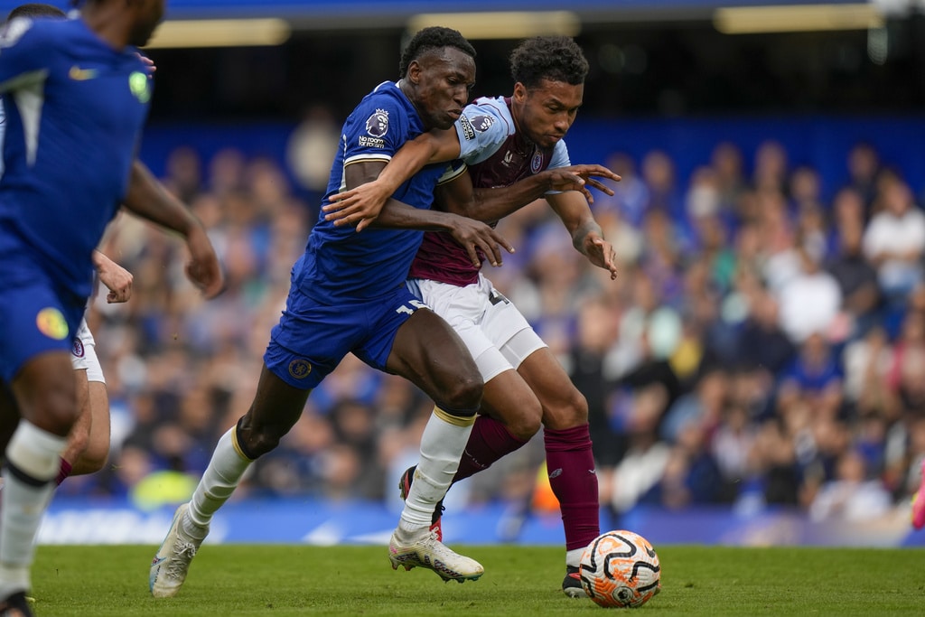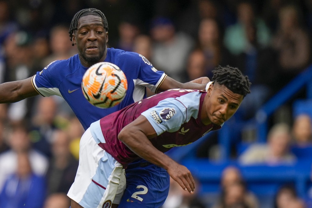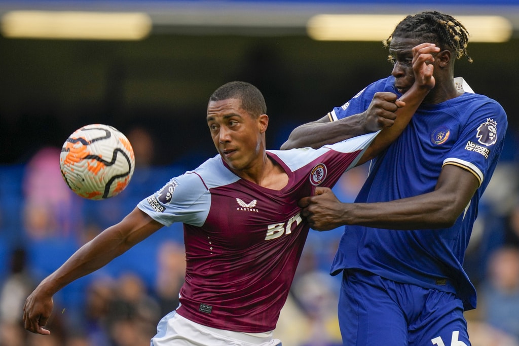 Aston Villa’s Youri Tielemans, left, jumps for the ball with Chelsea’s Lesley Ugochukwu during the English Premier League soccer match between Chelsea and Aston Villa at Stamford Bridge stadium in London, Sunday, Sept. 24, 2023. (AP Photo/Alastair Grant)