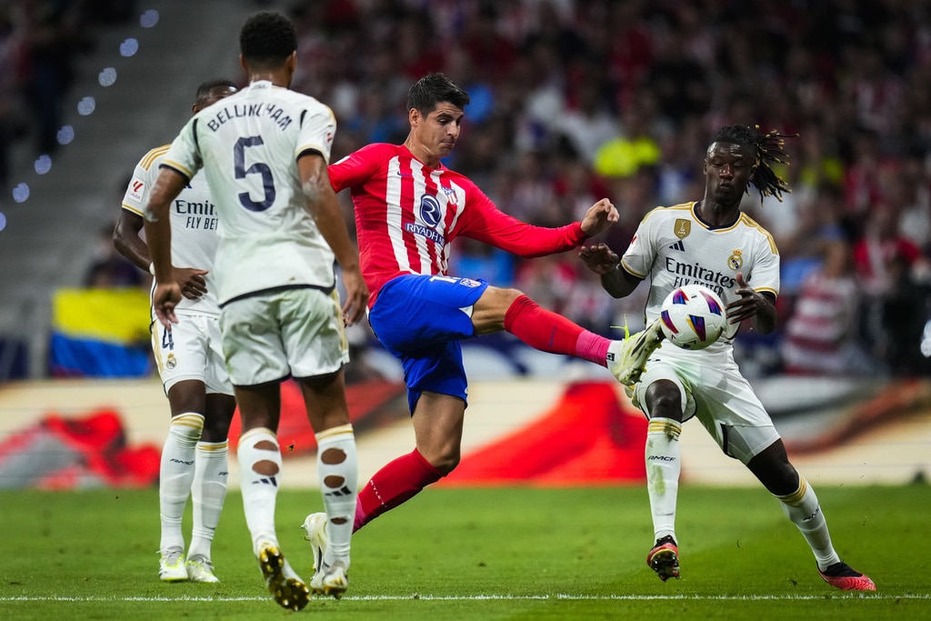 Atletico Madrid’s Alvaro Morata, left, vies for the ball with Real Madrid’s Eduardo Camavinga during the Spanish La Liga soccer match between Atletico Madrid and Real Madrid at Metropolitan stadium in Madrid, Sunday, Sept. 24, 2023. Morata scored twice in Atletico Madrid’s 3-1 victory. (AP Photo/Manu Fernandez)