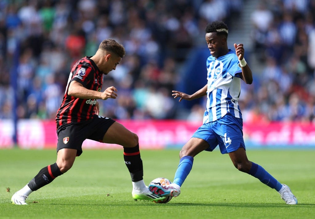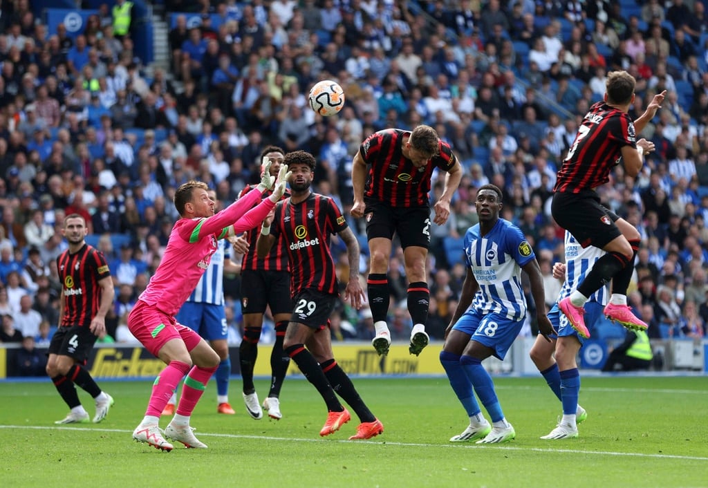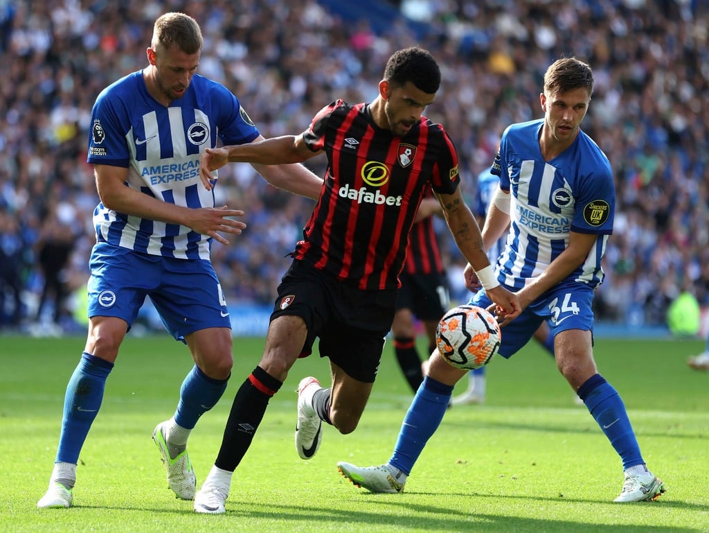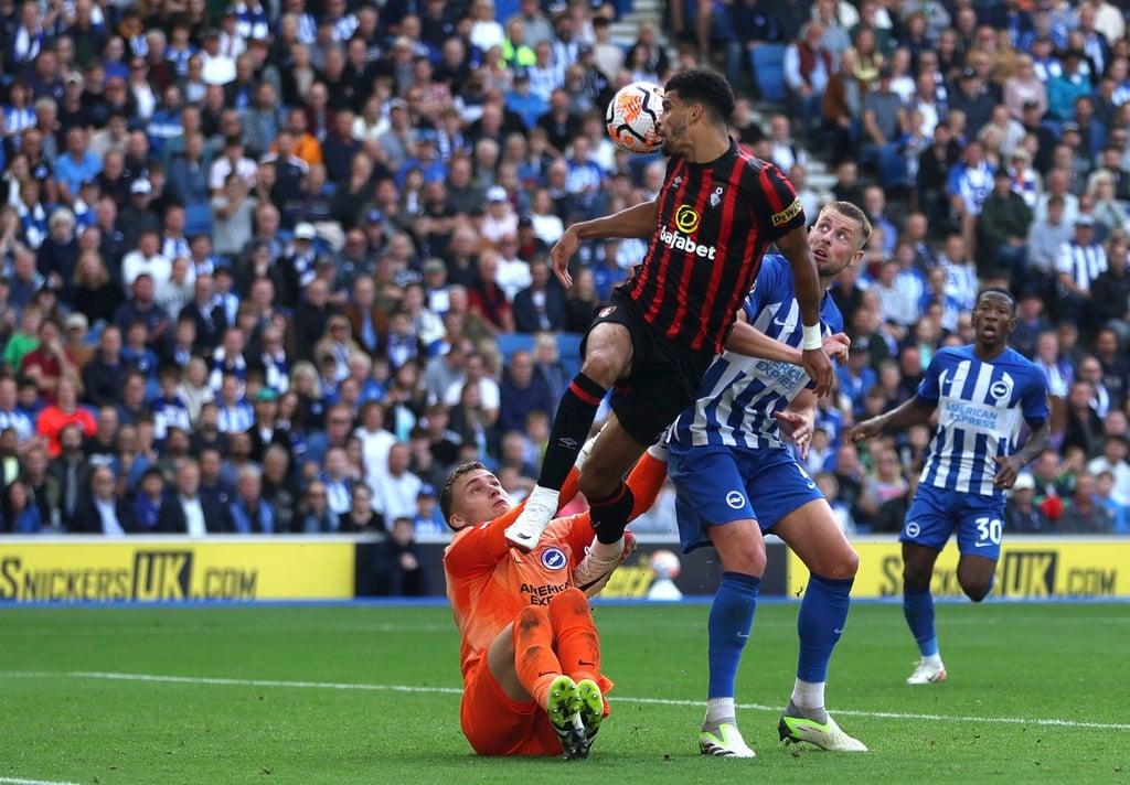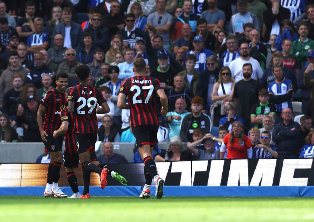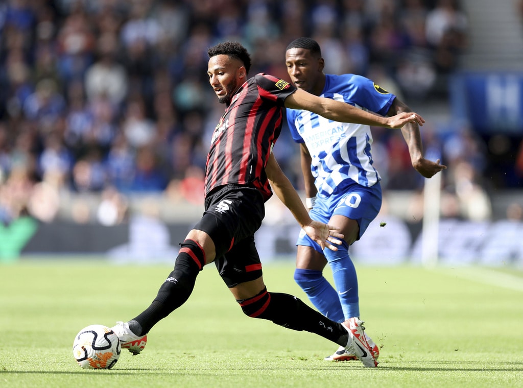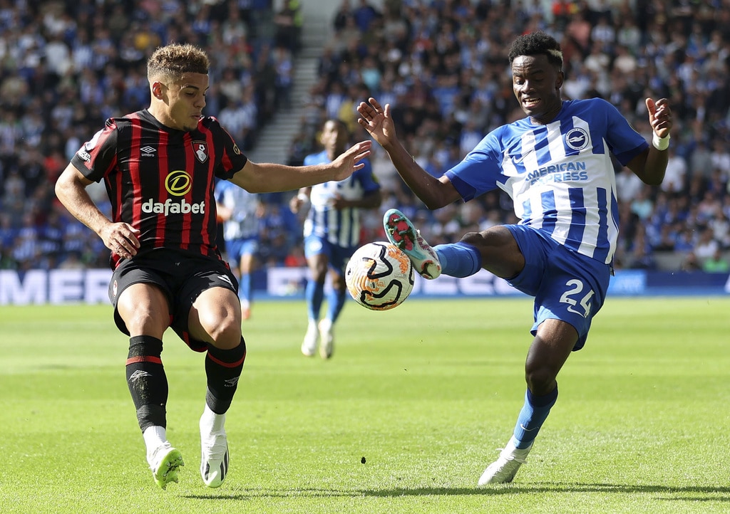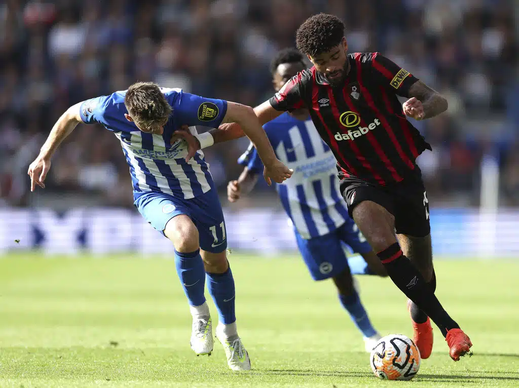 Brighton and Hove Albion’s Billy Gilmour, left, and Bournemouth’s Dominic Solanke during the English Premier League soccer match between Brighton and Hove Albion and Bournemouth at the AMEX Stadium, Brighton, England,: Sunday Sept. 24, 2023. (Steven Paston/PA via AP)Brighton and Hove Albion’s Adam Webster, left, and Joel Veltman challenge Bournemouth’s Dominic Solanke for the ball during the English Premier League soccer match between Brighton and Hove Albion and Bournemouth at the AMEX Stadium, Brighton, England,: Sunday Sept. 24, 2023. (Steven Paston/PA via AP)Brighton and Hove Albion’s Kaoru Mitoma celebrates scoring during the English Premier League soccer match between Brighton and Hove Albion and Bournemouth at the AMEX Stadium, Brighton, England,: Sunday Sept. 24, 2023. (Steven Paston/PA via AP)Bournemouth’s Milos Kerkez, right, scores an own goal during the English Premier League soccer match between Brighton and Hove Albion and Bournemouth at the AMEX Stadium, Brighton, England,: Sunday Sept. 24, 2023. (Steven Paston/PA via AP)Bournemouth’s Max Aarons, left, and Brighton and Hove Albion’s Simon Adingra battle for the ball during the English Premier League soccer match between Brighton and Hove Albion and Bournemouth at the AMEX Stadium, Brighton, England,: Sunday Sept. 24, 2023. (Steven Paston/PA via AP)Bournemouth’s Dominic Solanke, left, celebrates scoring with teammates during the English Premier League soccer match between Brighton and Hove Albion and Bournemouth at the AMEX Stadium, Brighton, England,: Sunday Sept. 24, 2023. (Steven Paston/PA via AP)Bournemouth’s Max Aarons, left, and Brighton and Hove Albion’s Simon Adingra battle for the ball during the English Premier League soccer match between Brighton and Hove Albion and Bournemouth at the AMEX Stadium, Brighton, England,: Sunday Sept. 24, 2023. (Steven Paston/PA via AP)Bournemouth’s Lloyd Kelly, left, and Brighton and Hove Albion’s Pervis Estupinan battle for the ball during the English Premier League soccer match between Brighton and Hove Albion and Bournemouth at the AMEX Stadium, Brighton, England,: Sunday Sept. 24, 2023. (Steven Paston/PA via AP)