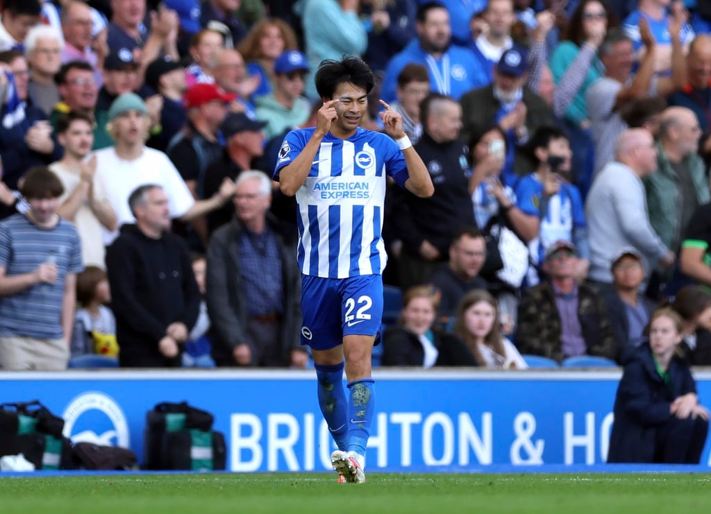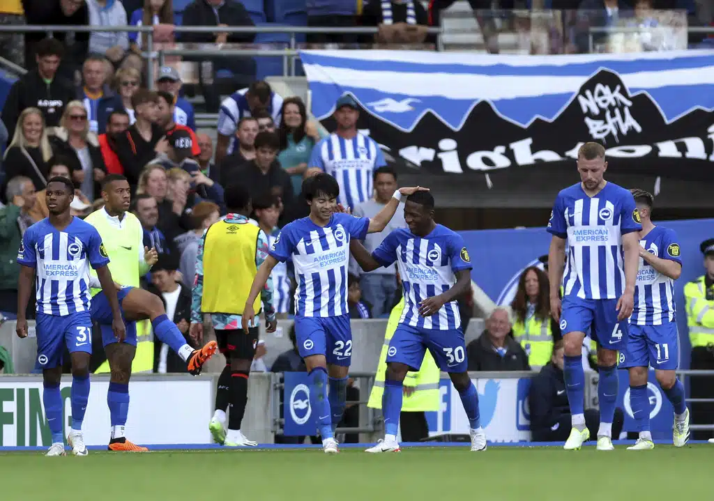 Brighton and Hove Albion’s Kaoru Mitoma, center left, celebrates scoring with teammates during the English Premier League soccer match between Brighton and Hove Albion and Bournemouth at the AMEX Stadium, Brighton, England,: Sunday Sept. 24, 2023. (Steven Paston/PA via AP)