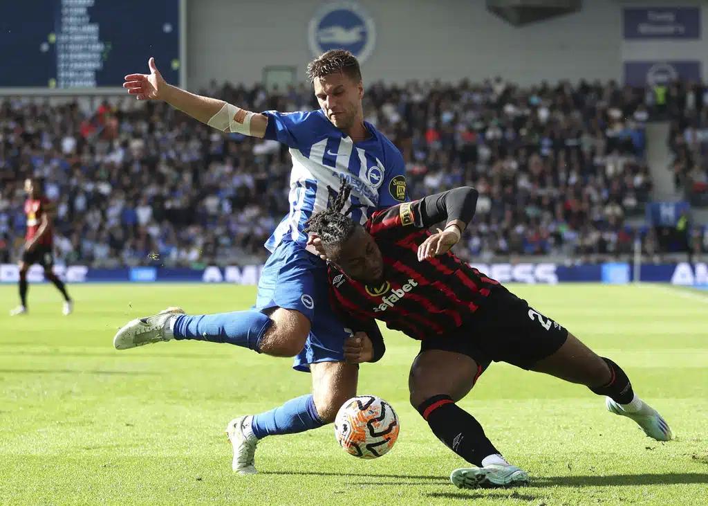 Brighton and Hove Albion’s Joel Veltman challenges Bournemouth’s Antoine Semenyo, right, during the English Premier League soccer match between Brighton and Hove Albion and Bournemouth at the AMEX Stadium, Brighton, England,: Sunday Sept. 24, 2023. (Steven Paston/PA via AP)