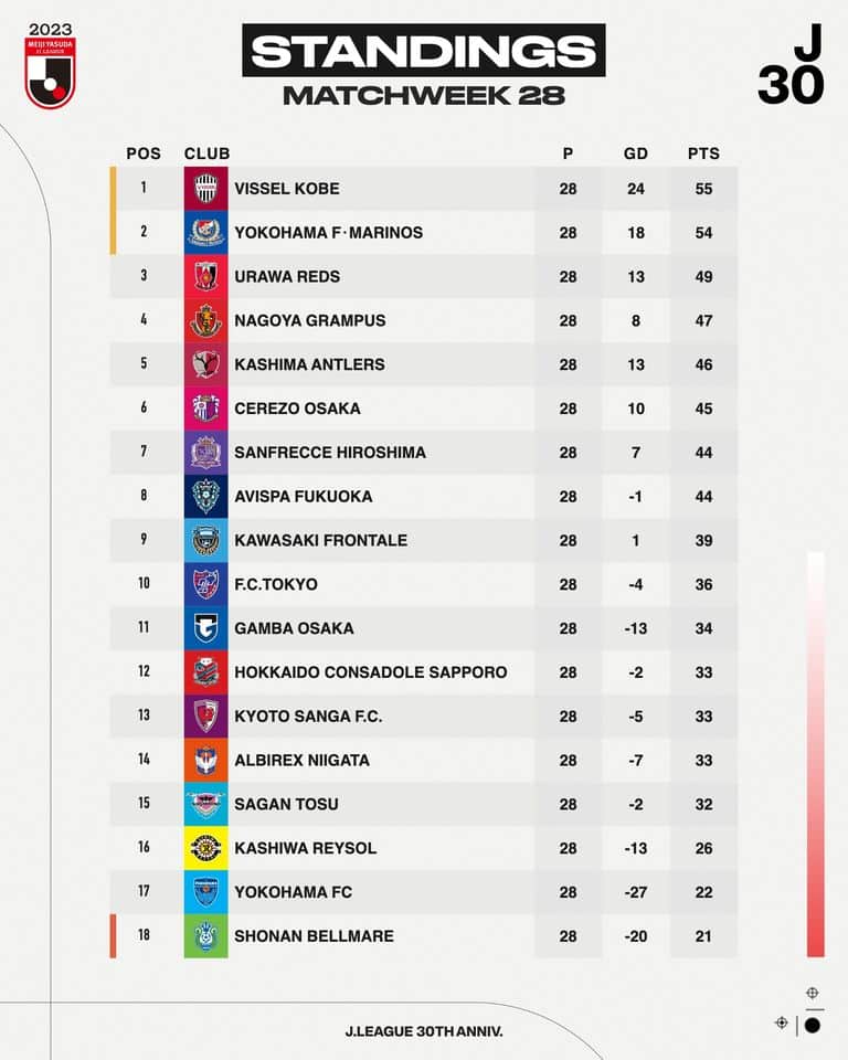 สถานการณ์ตารางคะแนนล่าสุดของศึก เจลีก ญี่ปุ่น 2023 วิทเซล โกเบ ยังนำเป็นจ่าฝูงด้วยการมี 55 แต้ม ตามหลังมาด้วยที่สองอย่าง โยโกฮาม่า มารินอส ที่มี 54 คะแนน ส่วนที่สามเป็น อุราวะ เรดส์ ที่มี 49 คะแนน