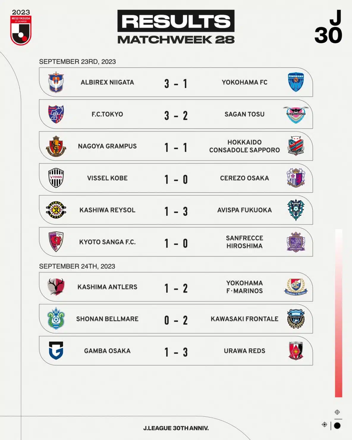 สรุปผลการแข่งขัน เจลีก ญี่ปุ่น 2023 หลังจบนัดที่ 28