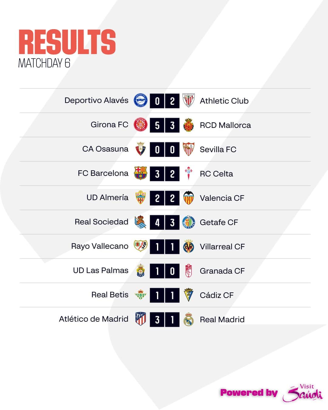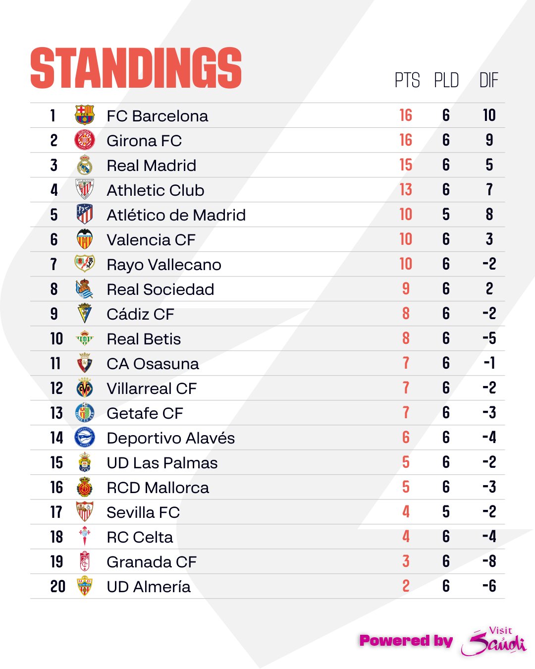 สรุปผล การแข่งขัน ลาลีกา สเปน 2023/24 หลังจบนัดที่ 6