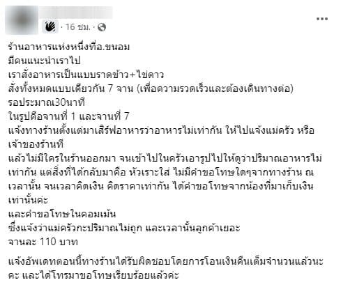 เจ้าของเล่าว่าหลังจากจานสุดท้ายมาเสิร์ฟเขาก็รีบเข้าครัวไปแจ้งกับทางร้านทันทีแต่กลับโดนขำใส่ ระบุข้อความว่า ‘ร้านอาหารแห่งหนึ่งที่ อ.ขนอม มีคนแนะนำเราไป เราสั่งอาหารเป็นแบบราดข้าว+ไข่ดาว สั่งทั้งหมดแบบเดียวกัน 7 จาน (เพื่อความรวดเร็วและต้องเดินทางต่อ) รอประมาณ 30 นาที ในรูปคือจานที่ 1 และจานที่ 7