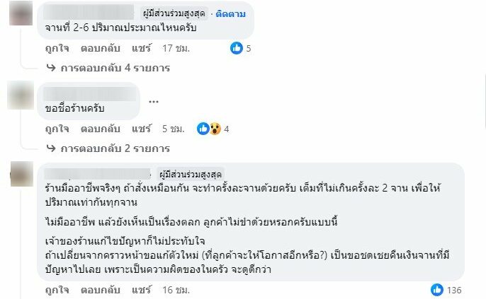 หลังโพสต์ดังกล่าวเผยแพร่ออกไปทำให้ผู้ใช้รายอื่นในกลุ่มเกิดความตกใจและเกิดข้อสงสัยจำนวนมาก มองว่าร้านทำแบบนี้ไม่ถูก เหตุใดจึงไม่ทำเพิ่มให้ อยากเห็นรูปอาหารจากที่ 2-6 ด้วยว่ามีปริมาณเท่าไหร่ และควรหาทางออกที่ดีกว่าหัวเราะใส่ลูกค้าเช่นนี้ บางคนแชร์ว่าเคยไปร้านนี้และถูกทำแบบนี้เช่นกัน บริการแบบนี้เมื่อเทียบกับราคาที่จ่ายถือว่าแพงไป