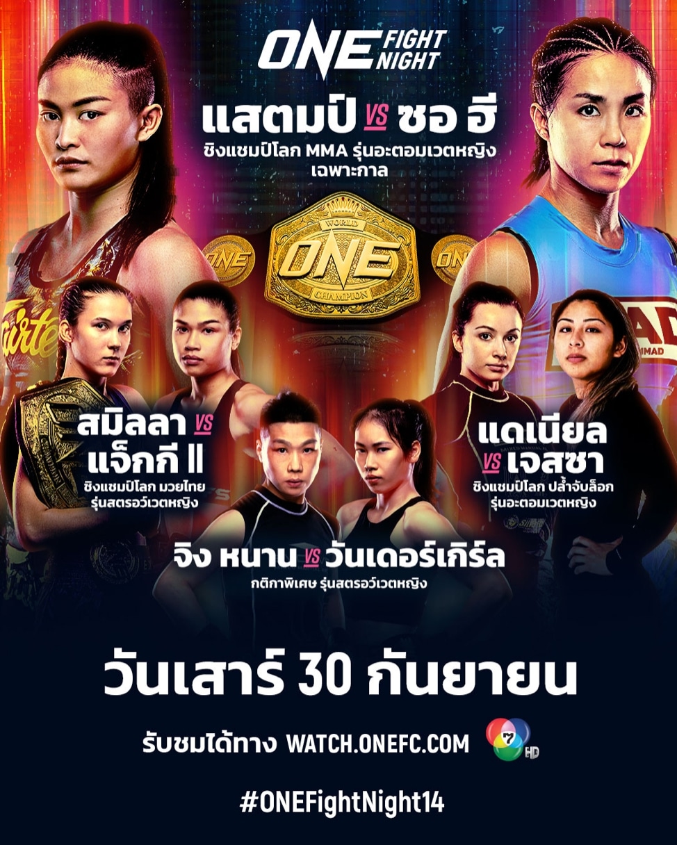 โดยคู่เอกของ “แสตมป์ แฟร์เท็กซ์” นักสู้สาวแกร่งวัย 25 ปี ดีกรีแชมป์ ONE MMA เวิลด์ กรังด์ปรีซ์ รุ่นอะตอมเวตหญิง (105-115 ป.) และผู้ท้าชิงอันดับหนึ่งของแรงกิงรุ่นนี้ จะขึ้นชิงแชมป์โลก ONE รุ่นอะตอมเวตหญิง เฉพาะกาล (105-115 ป.) ในกติกาการต่อสู้แบบผสมผสาน (MMA) พบกับ “ฮาม ซอ ฮี” นักสู้สาวมากประสบการณ์วัย 36 ปี จากเกาหลีใต้ ผู้รั้งอันดับสองของแรงกิง
