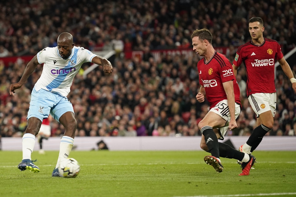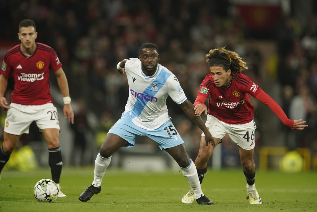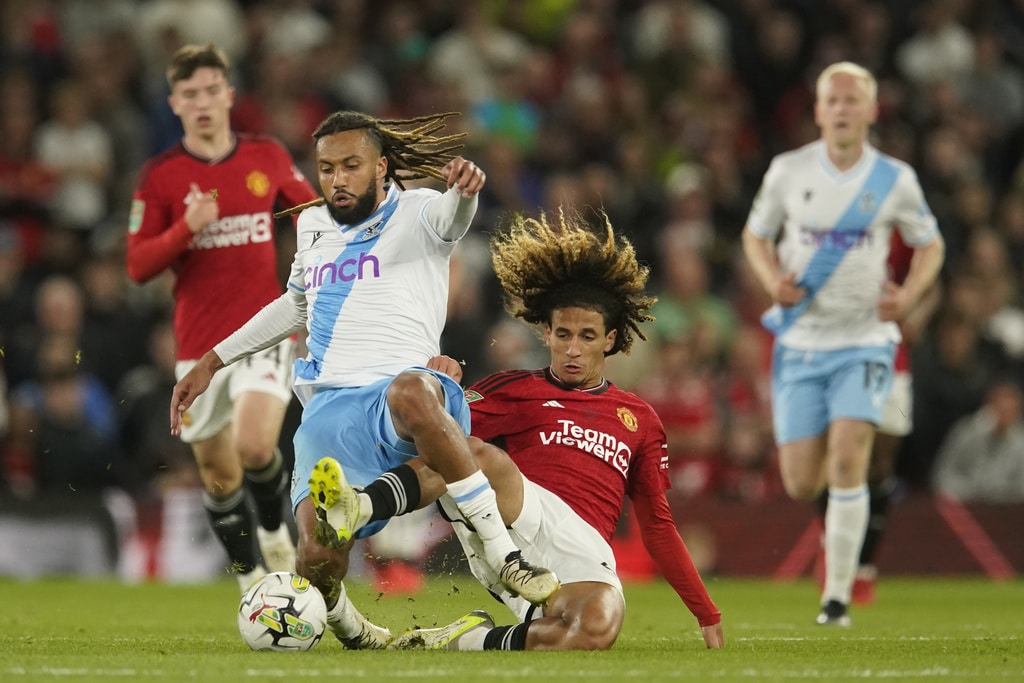 Crystal Palace’s Jeffrey Schlupp, center, is challenged by Manchester United’s Hannibal Mejbri, right, during the English League Cup third round soccer match between Manchester United and Crystal Palace at Old Trafford stadium in Manchester, England, Tuesday, Sept. 26, 2023. (AP Photo/Dave Thompson)
