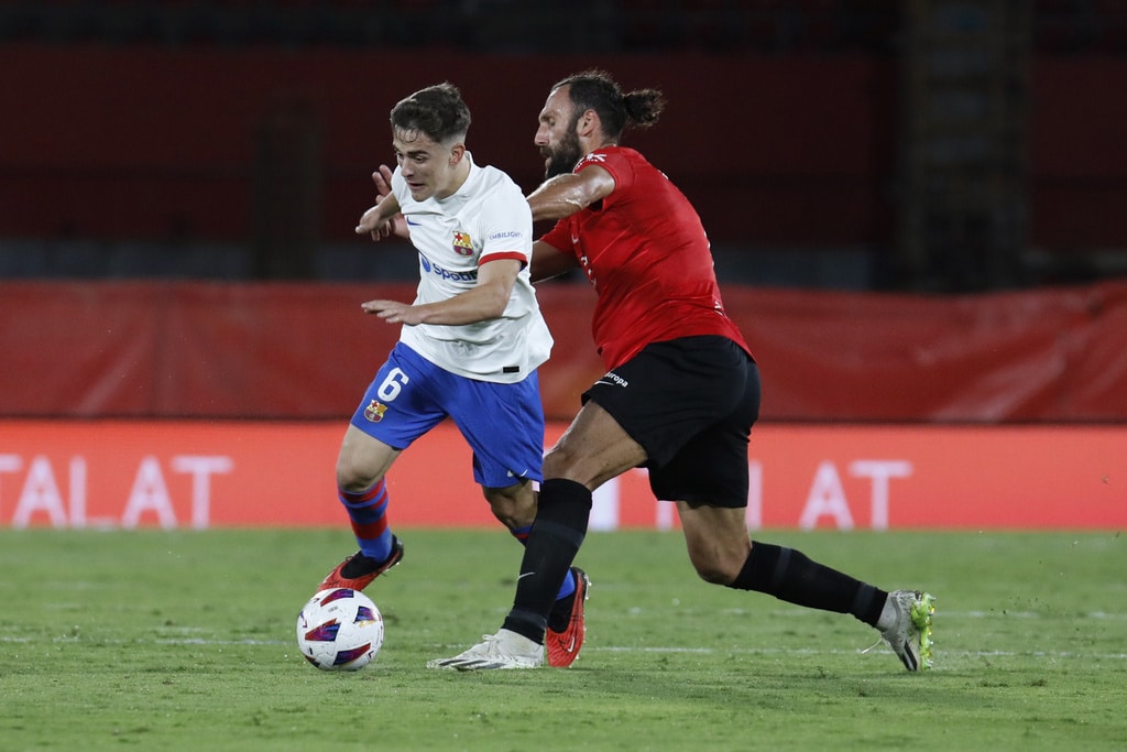 Barcelona’s Gavi, left, challenges for the ball with Mallorca’s Vedat Muriqi during a Spanish La Liga soccer match between Mallorca and Barcelona at the Son Moix stadium in Palma de Mallorca, Spain, Tuesday, Sept. 26, 2023. (AP Photo/Francisco Ubilla)