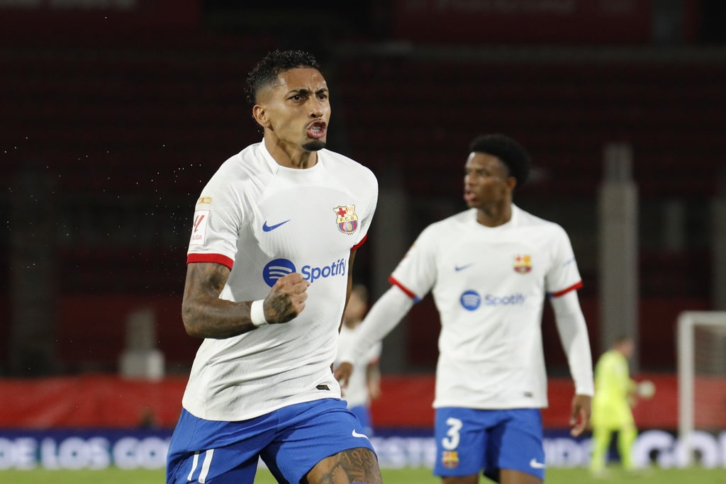 Barcelona’s Raphinha celebrates after scoring his side’s opening goal during a Spanish La Liga soccer match between Mallorca and Barcelona at the Son Moix stadium in Palma de Mallorca, Spain, Tuesday, Sept. 26, 2023. (AP Photo/Francisco Ubilla)