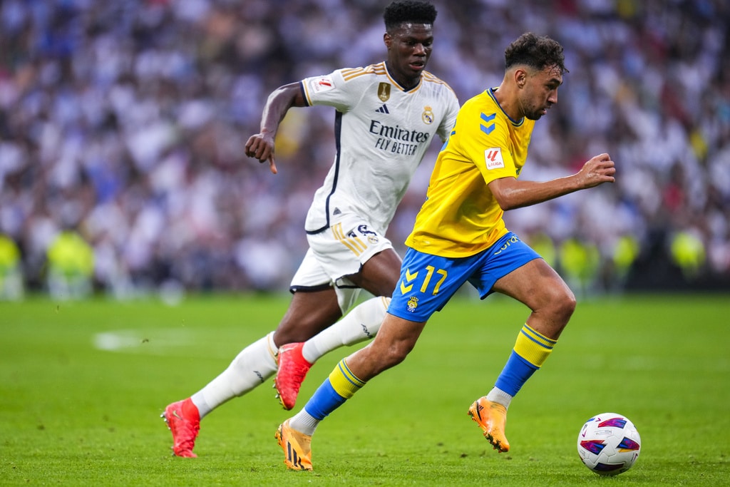 Las Palmas’ Munir El Haddadi, right, runs for the ball next to Real Madrid’s Aurelien Tchouameni during a Spanish La Liga soccer match between Real Madrid and Las Palmas, at Santiago Bernabeu stadium, in Madrid, Wednesday, Sept. 27, 2023. (AP Photo/Manu Fernandez)