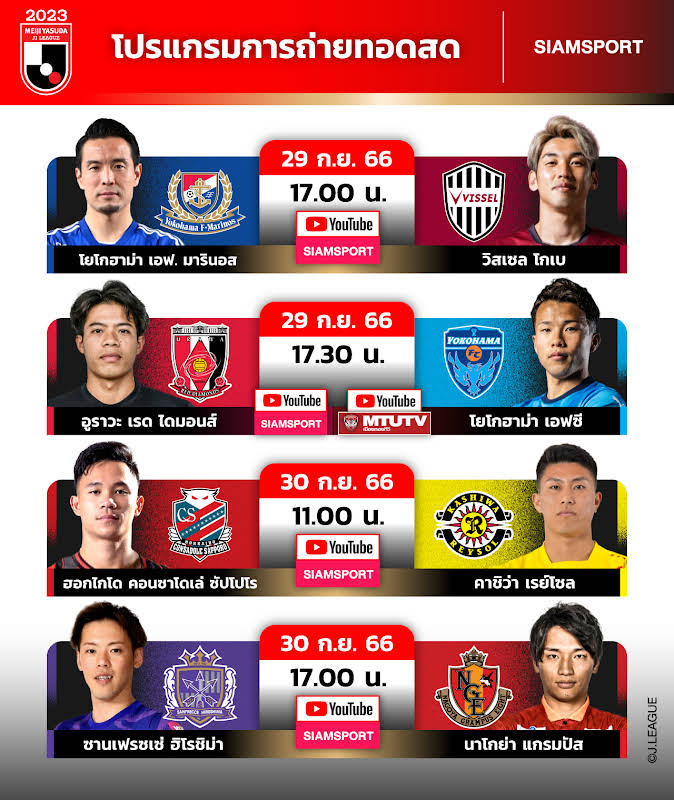 - 17:00 โยโกฮาม่า มารินอส พบ วิสเซล โคเบะ *ถ่ายทอดสดทาง Siamsport