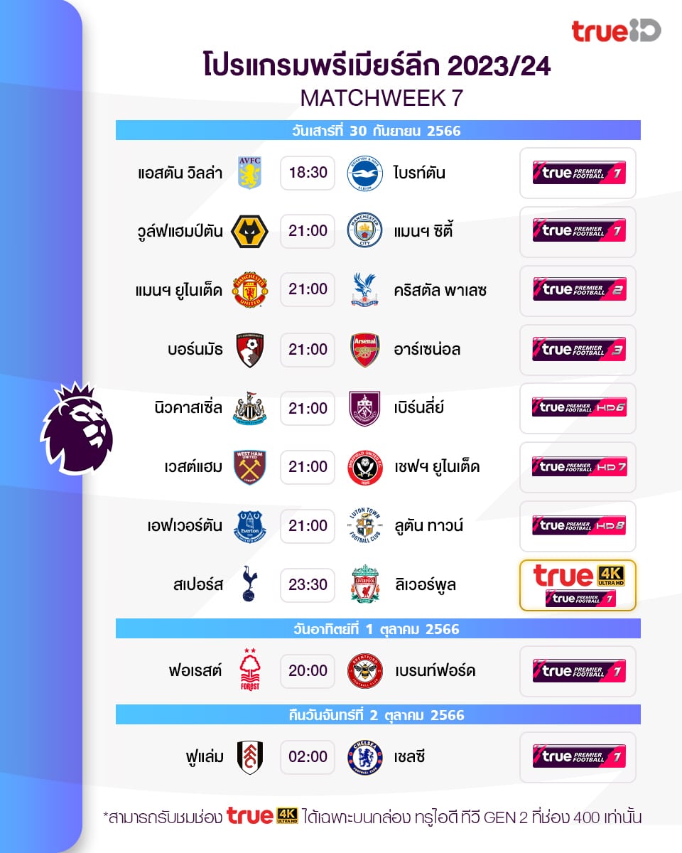 โปรแกรม พรีเมียร์ลีก ประจำฤดูกาล 2023/24 สัปดาห์ที่ 7 ของฤดูกาล