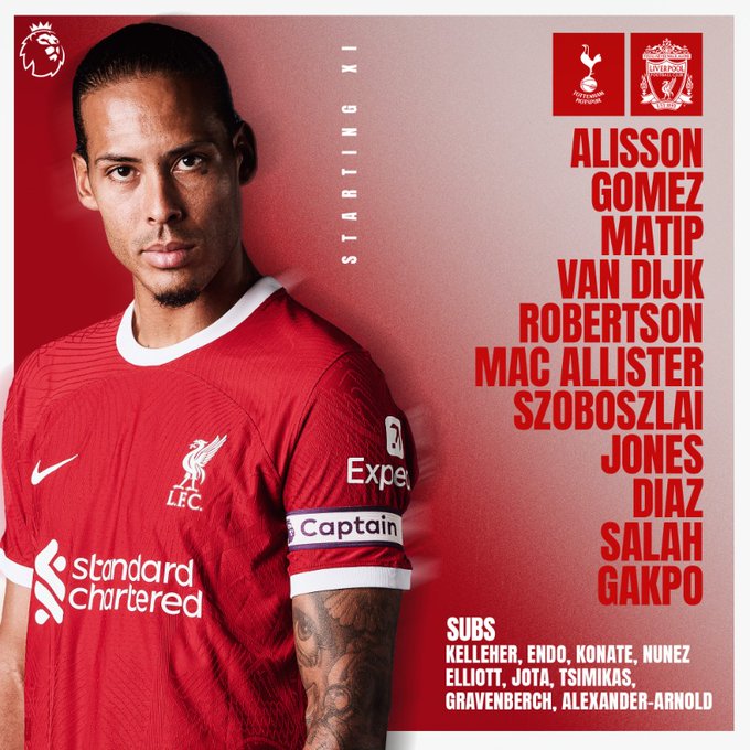 30 กันยายน 2566 รายชื่อผู้เล่น 11 ตัวจริง สเปอร์ส พบ ลิเวอร์พูล ศึกฟุตบอลพรีเมียร์ ฤดูกาล 2023-24 คืนนี้ ลิงก์ถูกลิขสิทธิ์ ดูบอลสดออนไลน์ ทาง True Premier Football เวลา 23:30 น.