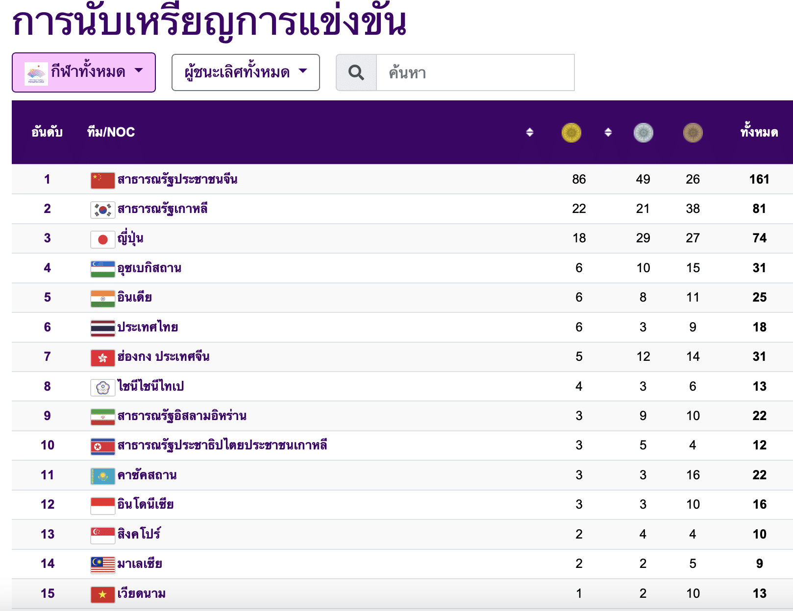 สรุปตารางเหรียญเอเชียนเกมส์ 2022 ล่าสุด 28 ก.ย. 2023 ทุกประเทศ