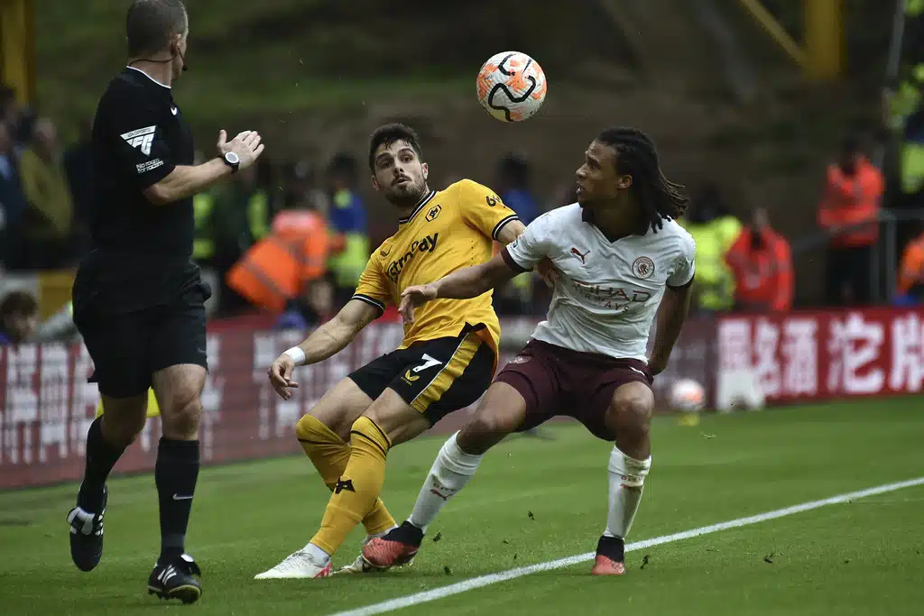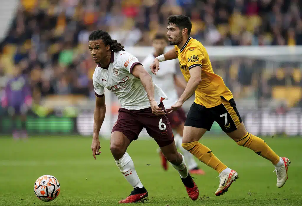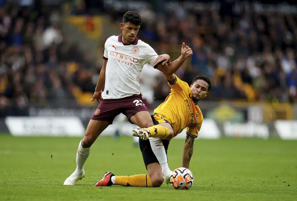 Wolverhampton Wanderers’ Pedro Neto, left, and Manchester City’s Nathan Ake battle for the ball during the English Premier League soccer match between Wolverhampton Wanderers and Manchester City at Molineux Stadium, Wolverhampton, England, Saturday Sept. 30, 2023. (Nick Potts/PA via AP)