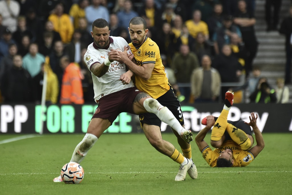 Manchester City’s Kyle Walker, left, and Wolverhampton Wanderers’ Rayan Ait-Nouri battle for the ball during the English Premier League soccer match between Wolverhampton Wanderers and Manchester City at Molineux Stadium, Wolverhampton, England, Saturday Sept. 30, 2023. (Nick Potts/PA via AP)