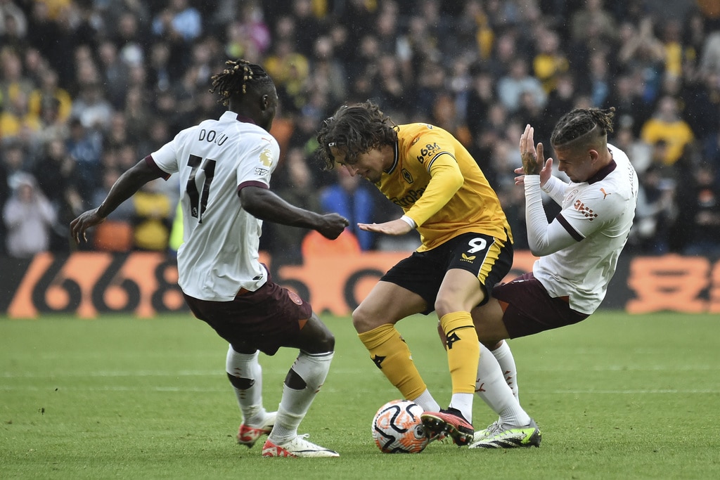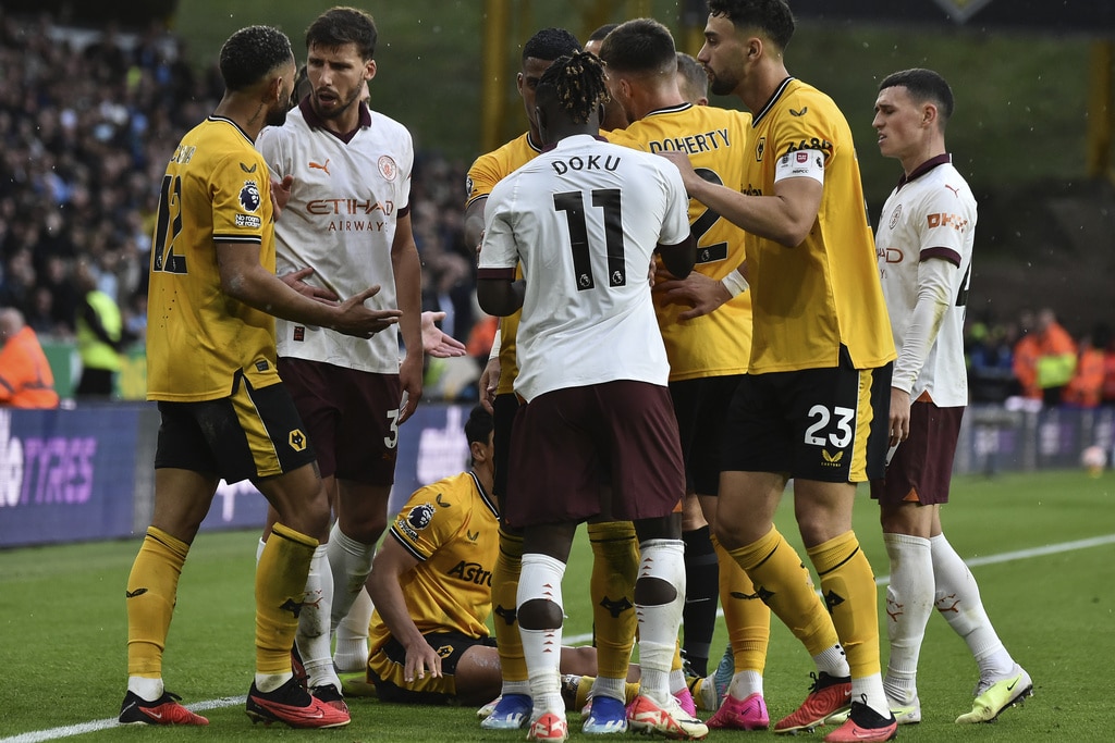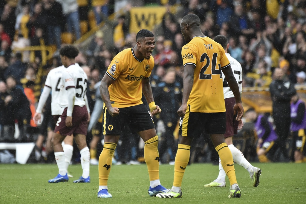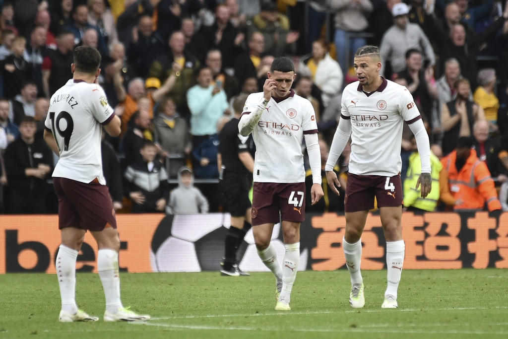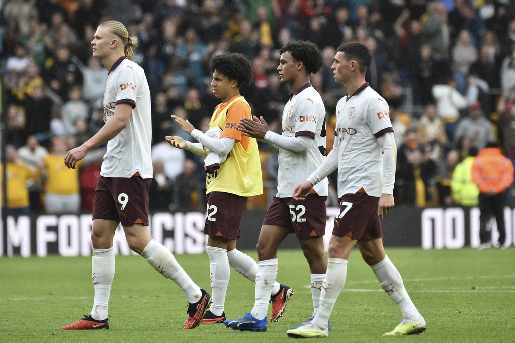Manchester City’s Kyle Walker, left, and Wolverhampton Wanderers’ Rayan Ait-Nouri battle for the ball during the English Premier League soccer match between Wolverhampton Wanderers and Manchester City at Molineux Stadium, Wolverhampton, England, Saturday Sept. 30, 2023. (Nick Potts/PA via AP)Manchester City’s Nathan Ake, left, and Wolverhampton Wanderers’ Pedro Neto battle for the ball during the English Premier League soccer match between Wolverhampton Wanderers and Manchester City at Molineux Stadium, Wolverhampton, England, Saturday Sept. 30, 2023. (Nick Potts/PA via AP)Manchester City’s Matheus Nunes, left, and Wolverhampton Wanderers’ Joao Gomes battle for the ball during the English Premier League soccer match between Wolverhampton Wanderers and Manchester City at Molineux Stadium, Wolverhampton, England, Saturday Sept. 30, 2023. (Nick Potts/PA via AP)Wolverhampton Wanderers’ Nelson Semedo, left, and Manchester City’s Mateo Kovacic battle for the ball during the English Premier League soccer match between Wolverhampton Wanderers and Manchester City at Molineux Stadium, Wolverhampton, England, Saturday Sept. 30, 2023. (Nick Potts/PA via AP)Wolverhampton Wanderers’ Pedro Neto, left, fights for the ball with Manchester City’s Nathan Ake during the English Premier League soccer match between Wolverhampton Wanderers and Manchester City at the Molineux Stadium in Wolverhampton, England, Saturday, Sept. 30, 2023. (AP Photo/Rui Vieira)Manchester City’s Kyle Walker, left, fights for the ball with Wolverhampton Wanderers’ Rayan Ait-Nouri during the English Premier League soccer match between Wolverhampton Wanderers and Manchester City at the Molineux Stadium in Wolverhampton, England, Saturday, Sept. 30, 2023. (AP Photo/Rui Vieira)Manchester City’s Kalvin Phillips, right, Manchester City’s Phil Foden, center, and Manchester City’s Julian Alvarez react Wolverhampton Wanderers’ Hwang Hee-chan scores his side’s second goal during the English Premier League soccer match between Wolverhampton Wanderers and Manchester City at the Molineux Stadium in Wolverhampton, England, Saturday, Sept. 30, 2023. (AP Photo/Rui Vieira)Wolverhampton Wanderers’ Hwang Hee-chan, second right, celebrates after scoring his side’s second goal during the English Premier League soccer match between Wolverhampton Wanderers and Manchester City at the Molineux Stadium in Wolverhampton, England, Saturday, Sept. 30, 2023. (AP Photo/Rui Vieira)Manchester City’s Kalvin Phillips, right, speaks with Manchester City’s Phil Foden after Wolverhampton Wanderers’ Hwang Hee-chan scores his side’s second goal during the English Premier League soccer match between Wolverhampton Wanderers and Manchester City at the Molineux Stadium in Wolverhampton, England, Saturday, Sept. 30, 2023. (AP Photo/Rui Vieira)Players of Wolverhampton Wanderers and Manchester City argue with each other during the English Premier League soccer match between Wolverhampton Wanderers and Manchester City at the Molineux Stadium in Wolverhampton, England, Saturday, Sept. 30, 2023. (AP Photo/Rui Vieira)Wolverhampton Wanderers’ Fabio Silva, left, fights for the ball with Manchester City’s Kalvin Phillips, right, and Manchester City’s Jeremy Doku during the English Premier League soccer match between Wolverhampton Wanderers and Manchester City at the Molineux Stadium in Wolverhampton, England, Saturday, Sept. 30, 2023. (AP Photo/Rui Vieira)Wolverhampton Wanderers’ goalkeeper Dan Bentley, right, and Wolverhampton Wanderers’ Mario Lemina celebrates at the end of the English Premier League soccer match between Wolverhampton Wanderers and Manchester City at the Molineux Stadium in Wolverhampton, England, Saturday, Sept. 30, 2023. Wolverhampton won 2-1. (AP Photo/Rui Vieira)Manchester City’s Erling Haaland, left, Manchester City’s Rico Lewis, second left, Manchester City’s Oscar Bobb, second right, and Manchester City’s Phil Foden applaud fans at the end of the English Premier League soccer match between Wolverhampton Wanderers and Manchester City at the Molineux Stadium in Wolverhampton, England, Saturday, Sept. 30, 2023. Wolverhampton won 2-1. (AP Photo/Rui Vieira)