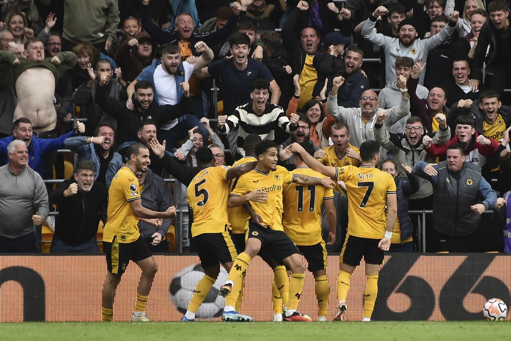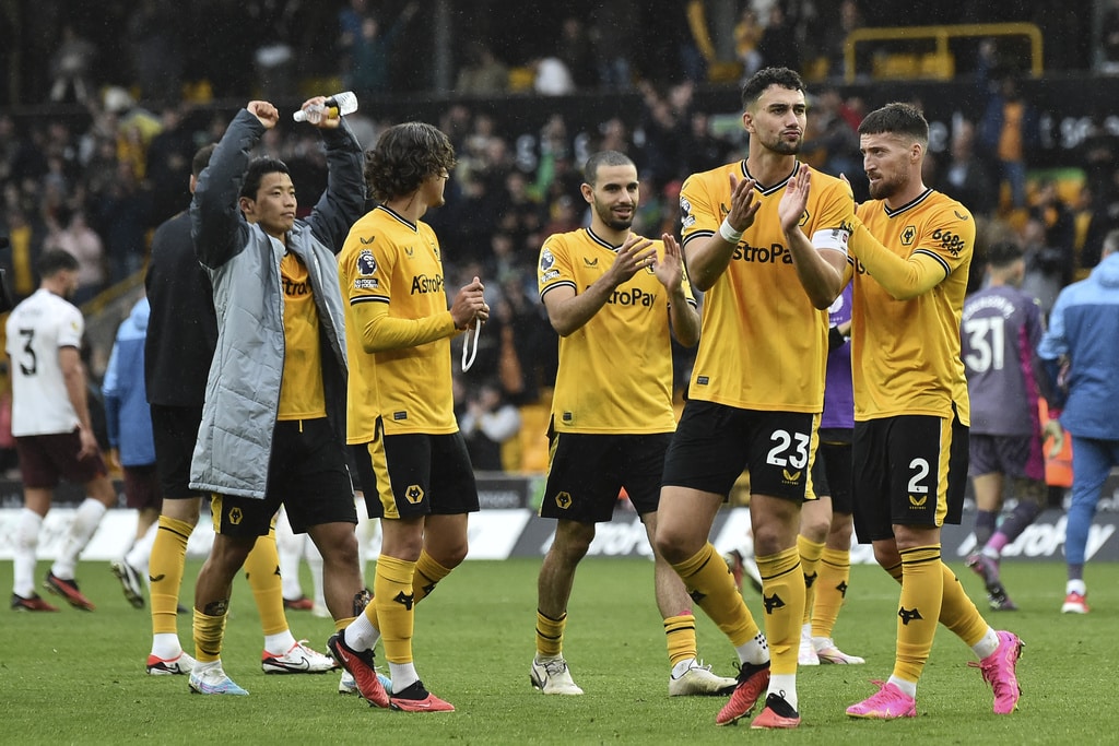 Wolverhampton Wanderers players applaud fans at the end of the English Premier League soccer match between Wolverhampton Wanderers and Manchester City at the Molineux Stadium in Wolverhampton, England, Saturday, Sept. 30, 2023. Wolverhampton won 2-1. (AP Photo/Rui Vieira)
