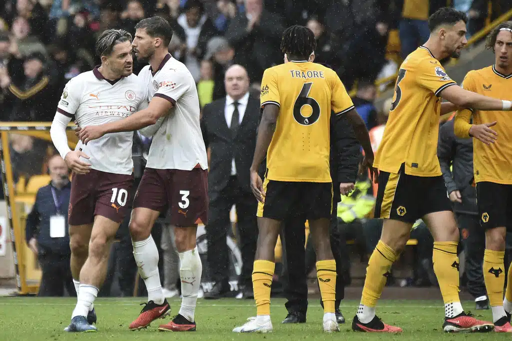 Manchester City’s Jack Grealish, left, argues with Wolverhampton Wanderers players at the end of the English Premier League soccer match between Wolverhampton Wanderers and Manchester City at the Molineux Stadium in Wolverhampton, England, Saturday, Sept. 30, 2023. Wolverhampton won 2-1. (AP Photo/Rui Vieira)