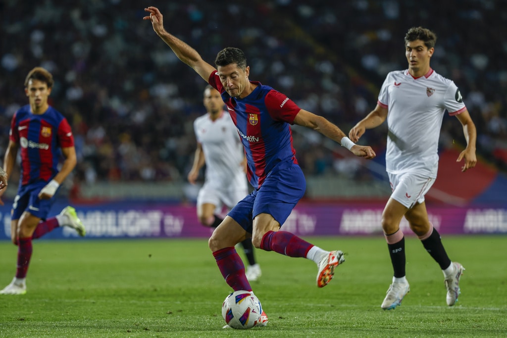 Barcelona’s Robert Lewandowski controls the ball during a Spanish La Liga soccer match between Barcelona and Sevilla, at the Olympic Stadium of Montjuic in Barcelona, Spain, Friday, Sept. 29, 2023. (AP Photo/Joan Monfort)