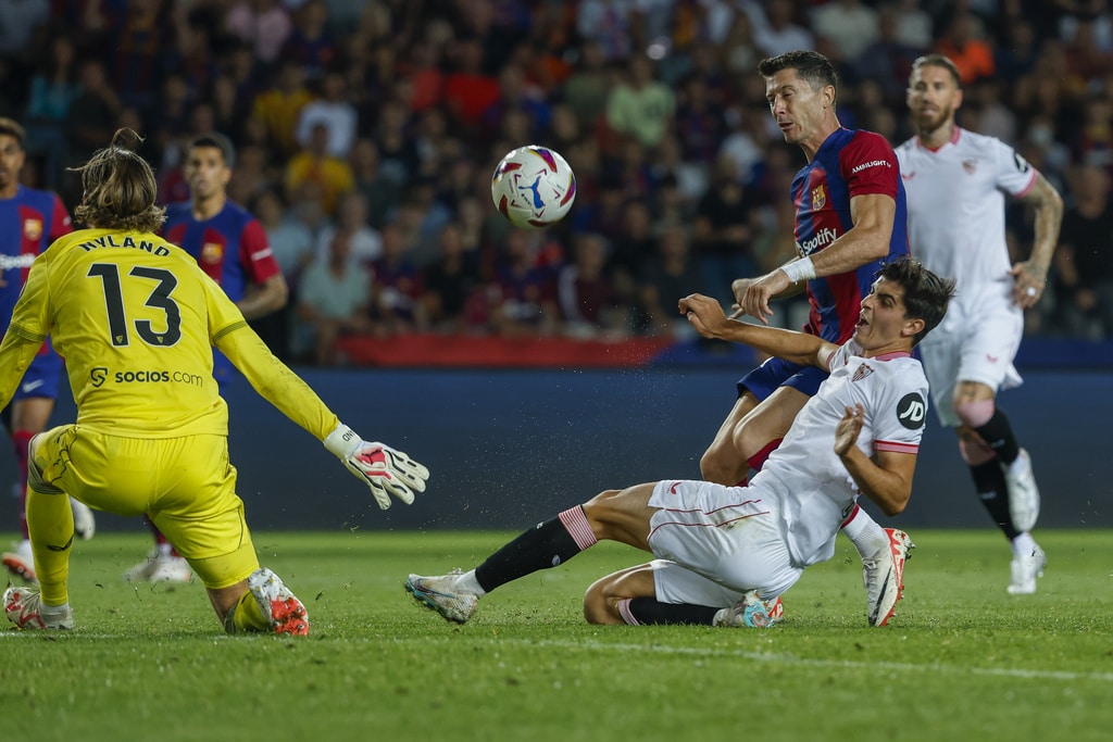 Sevilla’s Marcos Acuna, second left, tries to block a shot from Barcelona’s Robert Lewandowski during a Spanish La Liga soccer match between Barcelona and Sevilla, at the Olympic Stadium of Montjuic in Barcelona, Spain, Friday, Sept. 29, 2023. (AP Photo/Joan Monfort)