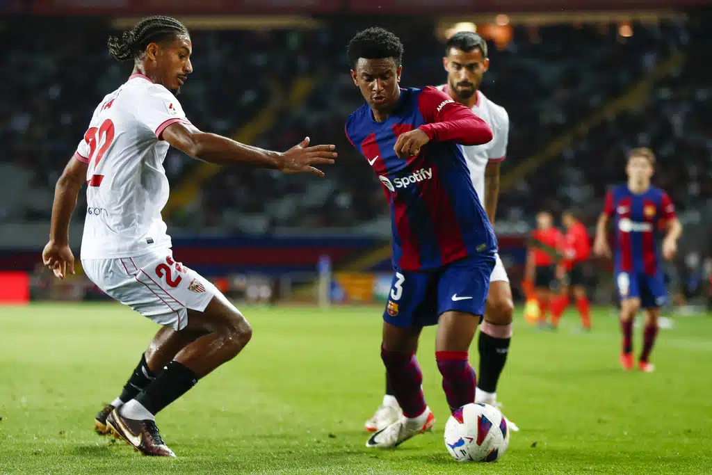 Barcelona’s Alejandro Balde, right, duels for the ball with Sevilla’s Loic Bade during a Spanish La Liga soccer match between Barcelona and Sevilla, at the Olympic Stadium of Montjuic in Barcelona, Spain, Friday, Sept. 29, 2023. (AP Photo/Joan Monfort)