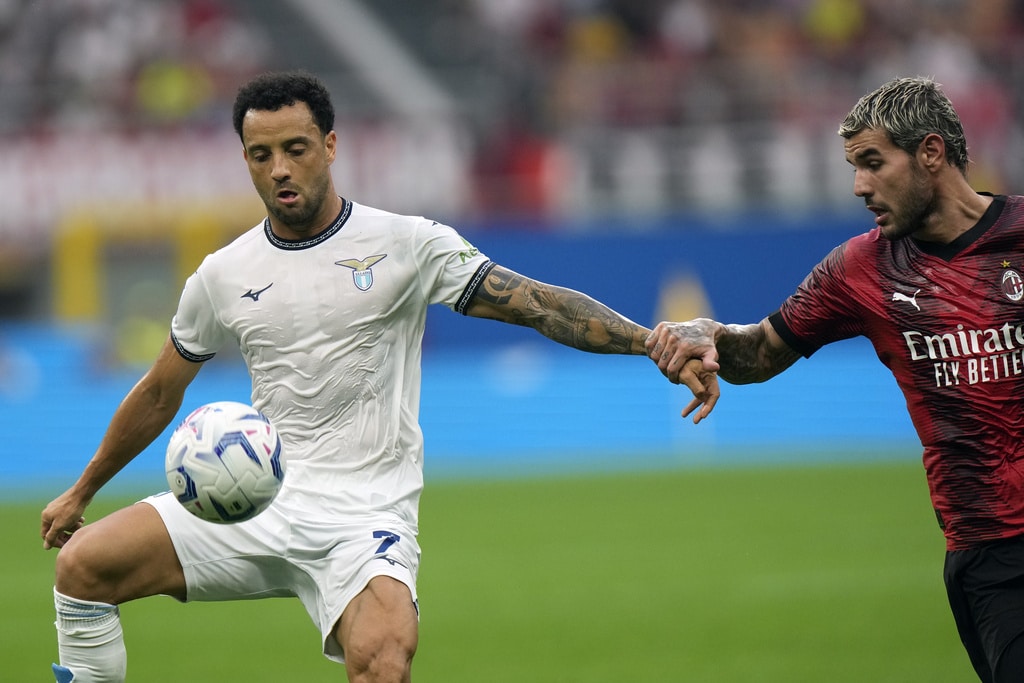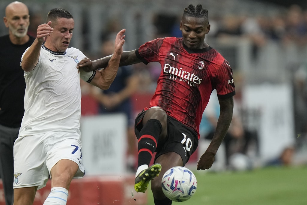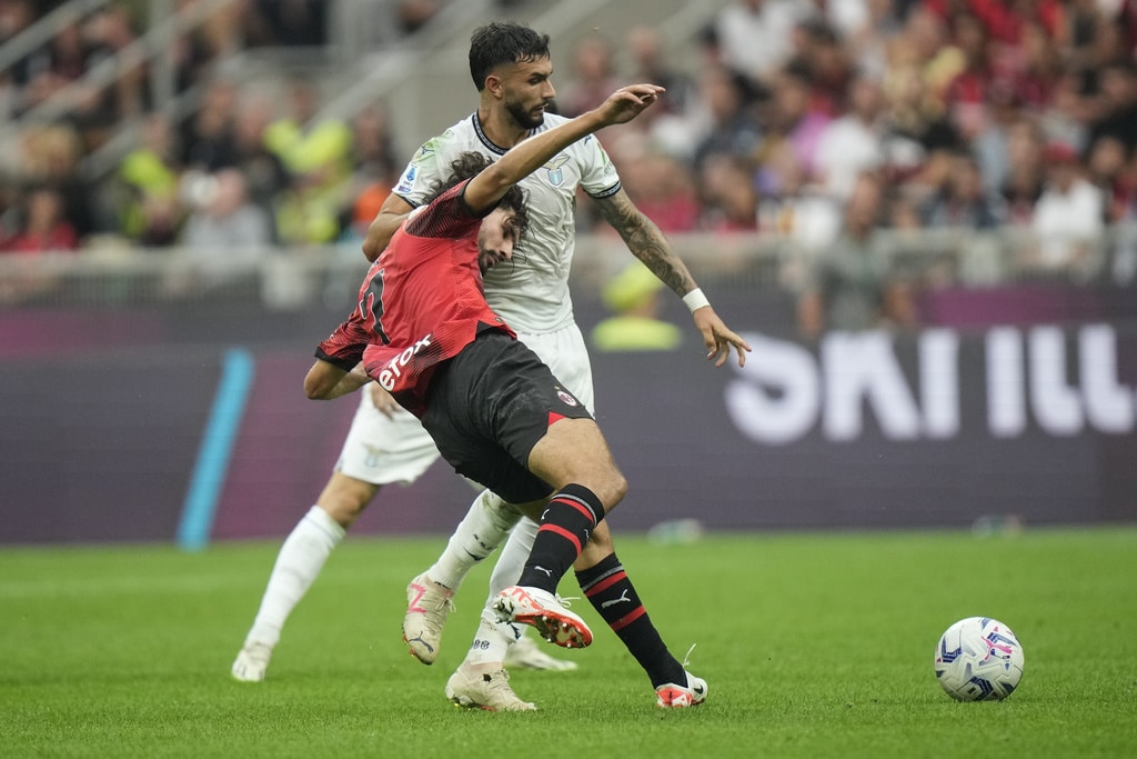 Lazio’s Mattia Zaccagni, right, takes on AC Milan’s Fikayo Tomori during a Serie A soccer match between AC Milan and Lazio, at the San Siro stadium in Milan, Italy, Saturday, Sept. 30, 2023. (AP Photo/Luca Bruno)