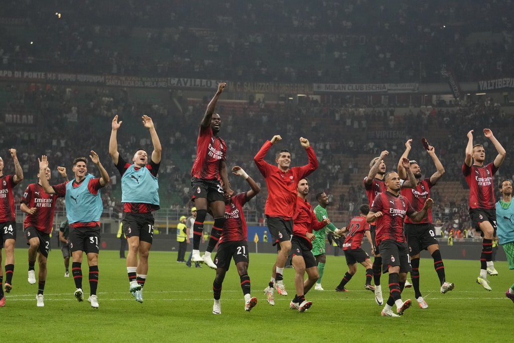AC Milan players celebrate their 2-0 win at the end of a Serie A soccer match between AC Milan and Lazio, at the San Siro stadium in Milan, Italy, Saturday, Sept. 30, 2023. (AP Photo/Luca Bruno)