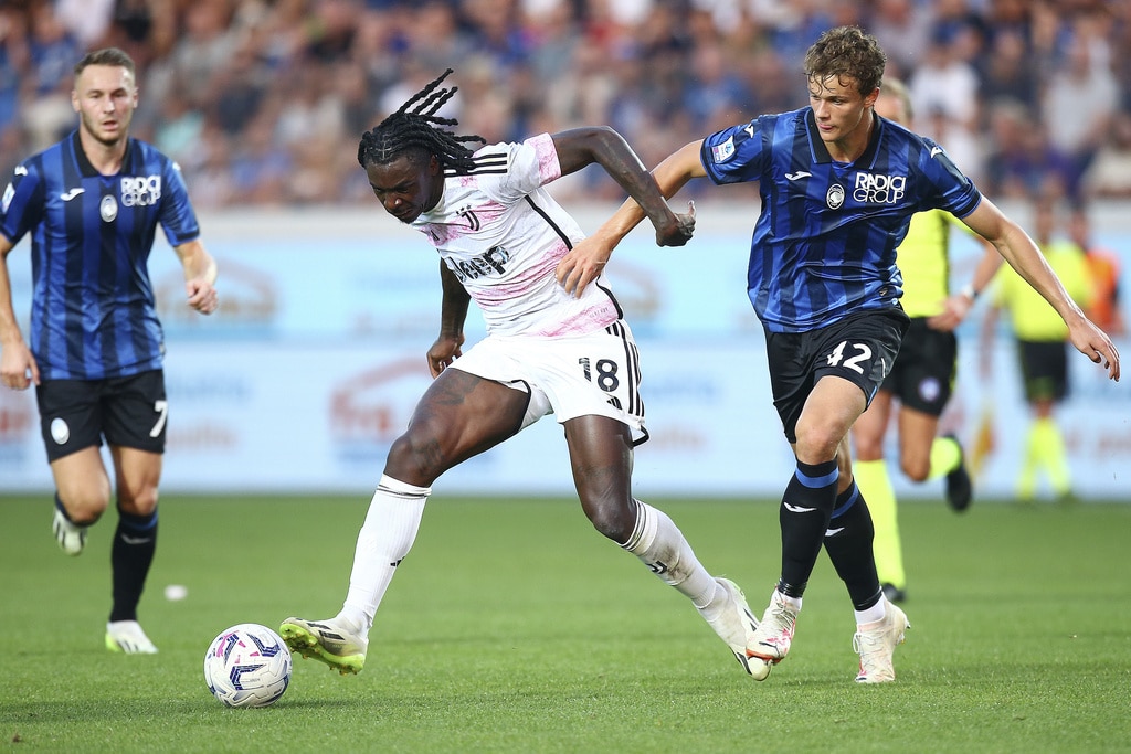 Juventus’ Moise Kean, center, is challenged by Atalanta’s Giorgio Scalvini , left, and Marten de Roon during the Serie A soccer match between Atalanta and Juventus at the Gewiss stadium in Bergamo, Italy, Sunday, Oct. 1, 2023. (Spada/LaPresse via AP)