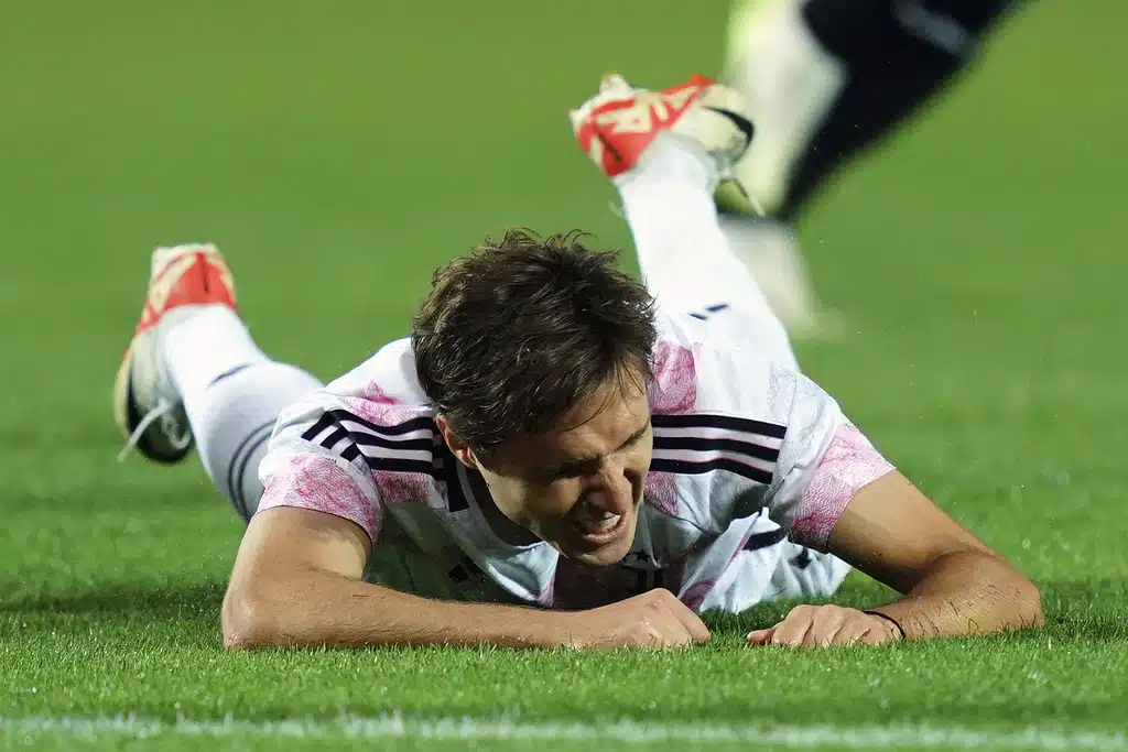 Juventus’ Federico Chiesa grimaces on the ground during the Serie A soccer match between Atalanta and Juventus at the Gewiss stadium in Bergamo, Italy, Sunday, Oct. 1, 2023. (Spada/LaPresse via AP)