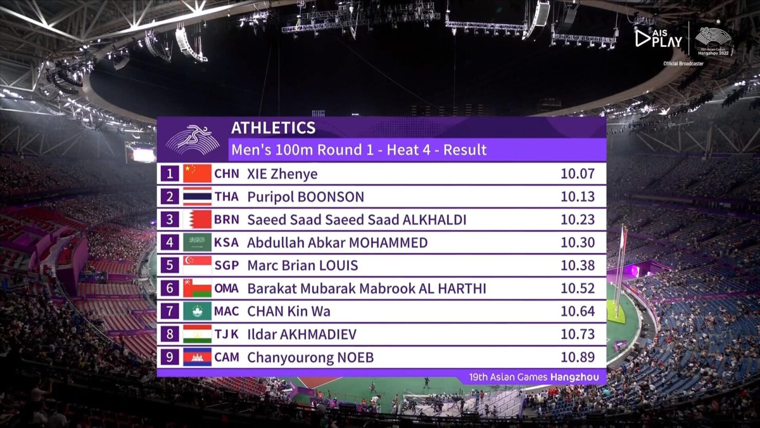 ผลการวิ่งปรากฏว่า “ต้า” สรอรรถ ดาบบัง ลงแข่งในฮีตที่ 1 และเร่งสปีดปลายแซงเข้าเส้นชัยเป็นคนแรกในฮีตที่ 1 ด้วยเวลา 10.26 วินาที ส่วน “บิว” ภูริพล บุญสอน ลงแข่งในฮีตที่ 4 เข้าเส้นชัยเป็นที่ 2 ทำเวลาได้ 10.13 วินาที ผ่านเข้ารอบรองชนะเลิศได้เช่นกัน