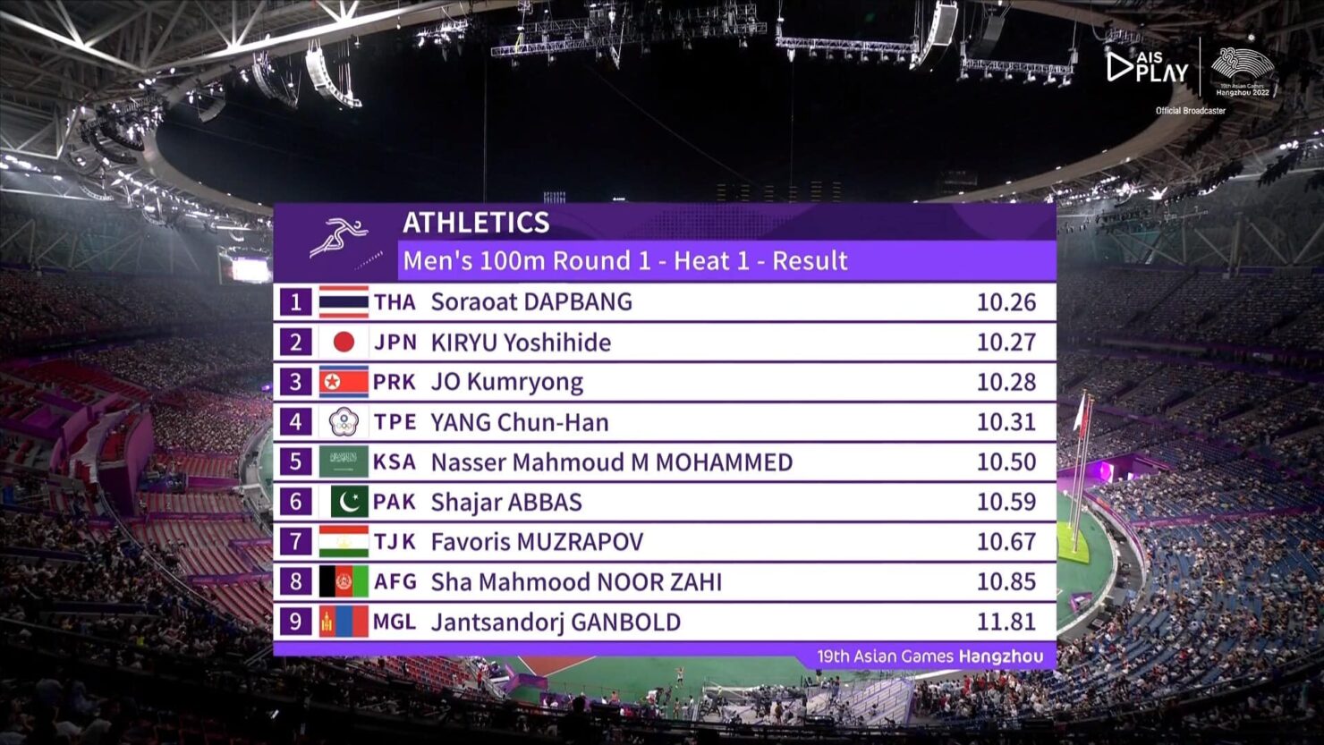 การแข่งขันกรีฑาใน เอเชียนเกมส์ 2022 ที่หางโจว สาธารณรัฐประชาชนจีน เมื่อวันที่ 29 ก.ย. 2566 วันแรก วิ่ง 100 เมตร ชาย รอบคัดเลือก โดยนักกีฬาไทยมีลงสนาม 2 คน คือ “ต้า” สรอรรถ ดาบบัง และ “บิว” ภูริพล บุญสอน โดยกติกาคือจะคัดเอา 2 อันดับแรกในแต่ละฮีต ผ่านเข้ารอบรองชนะเลิศ ต่อไป