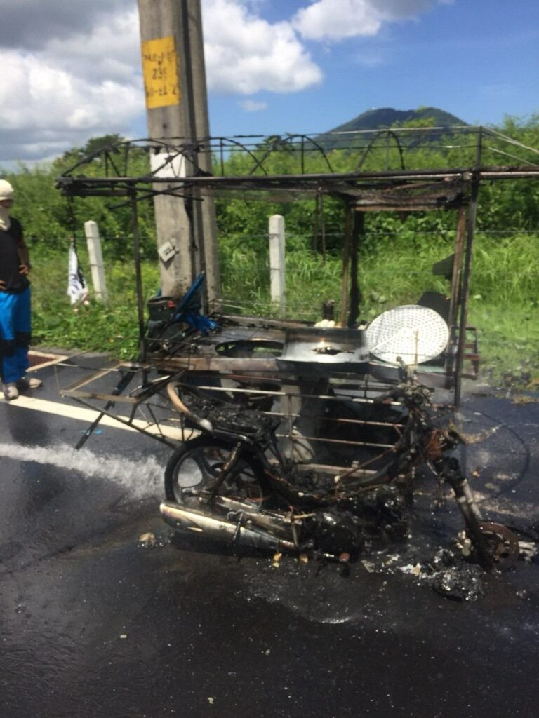 เพลิงไหม้รถสามล้อพ่วง คนขับกระโดดหนีตาย คาดสายแก๊สหลุดทำให้ไฟลุก