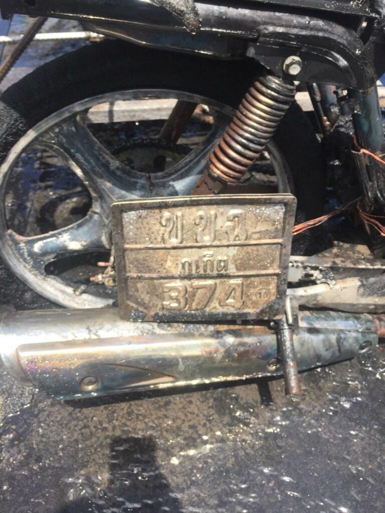 ที่เกิดเหตุอยู่ริมถนนดังกล่าว เห็นเพลิงกำลังรุกไหม้รถจักรยานยนต์ยี่ห้อฮอนด้า รุ่นเวฟ 125 สีเขียว หมายเลขทะเบียน ขขฉ 374 ภูเก็ต อย่างรวดเร็ว โดยทางเจ้าหน้าที่ฯได้กันไม่ให้รถขับผ่านถนนเส้นดังกล่าว ทางเจ้าหน้าที่ดับเพลิงจึงเร่งฉีดน้ำสกัดเพื่อไม่ให้เพลิงลุกลามไปติดทั้งคัน แต่การดับเพลิงเป็นไปด้วยความยากลำบากเนื่องรถคันดังกล่าวมีถังแก๊สอยู่ ทางเจ้าหน้าที่ฯจึงฉีดน้ำเข้าไปเพื่อควบคุมเพลิงโดยใช้เวลากว่า 20 นาทีจึงสามารถควบคุมเพลิงและเพลิงสงบในที่สุด ตรวจสอบในเบื้องต้น รถคันดังกล่าวถูกเพลิงเผาวอดได้รับความเสียหายทั้งคัน