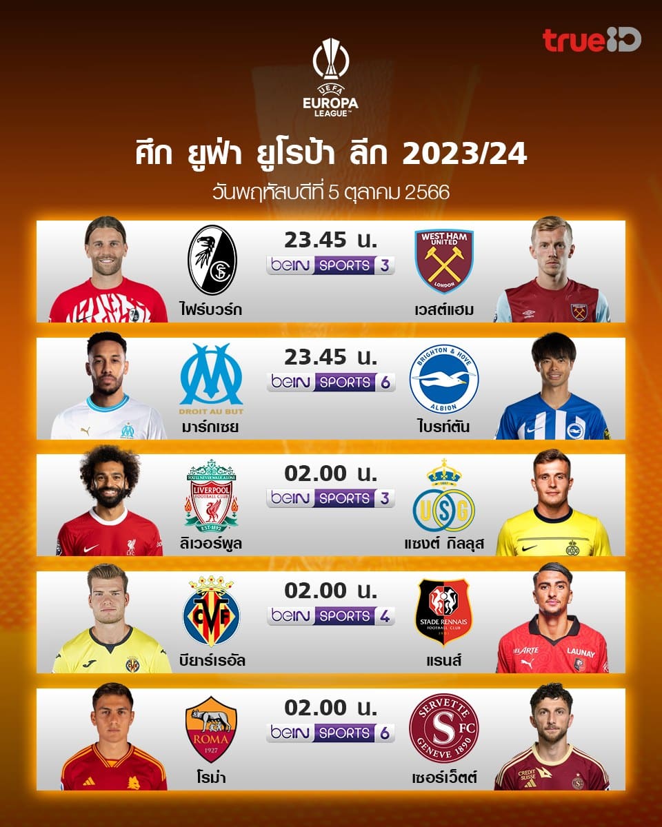 ยูโรป้า ลีก รอบแบ่งกลุ่ม 2023/24 วันพฤหัสบดีที่ 5 ตุลาคม 2566